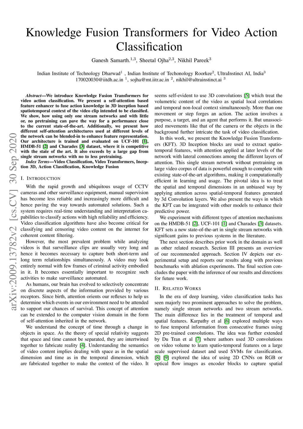 We introduce Knowledge Fusion Transformers for video action classification. We present a self-attention based feature enhancer to fuse action knowledge in 3D inception based spatio-temporal context of the video clip intended to be classified. We show, how using only one stream networks and with little or, no pretraining can pave the way for a performance close to the current state-of-the-art. Additionally, we present how different self-attention architectures used at different levels of the network can be blended-in to enhance feature representation. Our architecture is trained and evaluated on UCF-101 and Charades dataset, where it is competitive with the state of the art. It also exceeds by a large gap from single stream networks with no to less pretraining.