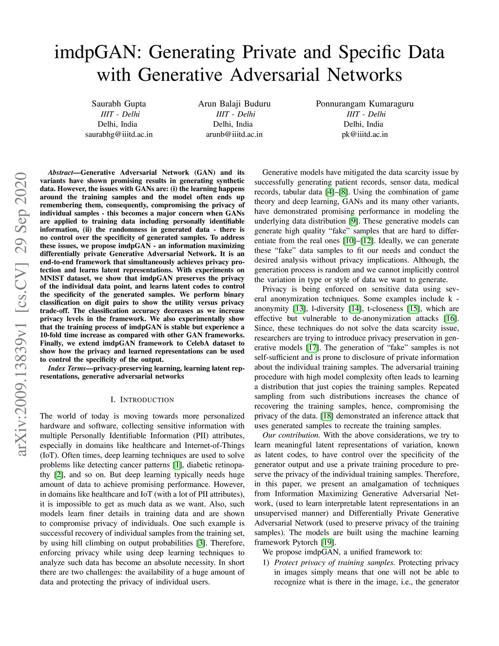 Generative Adversarial Network (GAN) and its variants have shown promising results in generating synthetic data. However, the issues with GANs are: (i) the learning happens around the training samples and the model often ends up remembering them, consequently, compromising the privacy of individual samples - this becomes a major concern when GANs are applied to training data including personally identifiable information, (ii) the randomness in generated data - there is no control over the specificity of generated samples. To address these issues, we propose imdpGAN - an information maximizing differentially private Generative Adversarial Network. It is an end-to-end framework that simultaneously achieves privacy protection and learns latent representations. With experiments on MNIST dataset, we show that imdpGAN preserves the privacy of the individual data point, and learns latent codes to control the specificity of the generated samples. We perform binary classification on digit pairs to show the utility versus privacy trade-off. The classification accuracy decreases as we increase privacy levels in the framework. We also experimentally show that the training process of imdpGAN is stable but experience a 10-fold time increase as compared with other GAN frameworks. Finally, we extend imdpGAN framework to CelebA dataset to show how the privacy and learned representations can be used to control the specificity of the output.