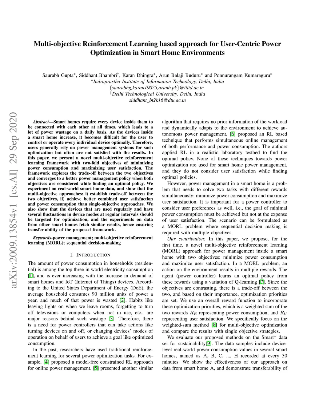 Smart homes require every device inside them to be connected with each other at all times, which leads to a lot of power wastage on a daily basis. As the devices inside a smart home increase, it becomes difficult for the user to control or operate every individual device optimally. Therefore, users generally rely on power management systems for such optimization but often are not satisfied with the results. In this paper, we present a novel multi-objective reinforcement learning framework with two-fold objectives of minimizing power consumption and maximizing user satisfaction. The framework explores the trade-off between the two objectives and converges to a better power management policy when both objectives are considered while finding an optimal policy. We experiment on real-world smart home data, and show that the multi-objective approaches: i) establish trade-off between the two objectives, ii) achieve better combined user satisfaction and power consumption than single-objective approaches. We also show that the devices that are used regularly and have several fluctuations in device modes at regular intervals should be targeted for optimization, and the experiments on data from other smart homes fetch similar results, hence ensuring transfer-ability of the proposed framework.