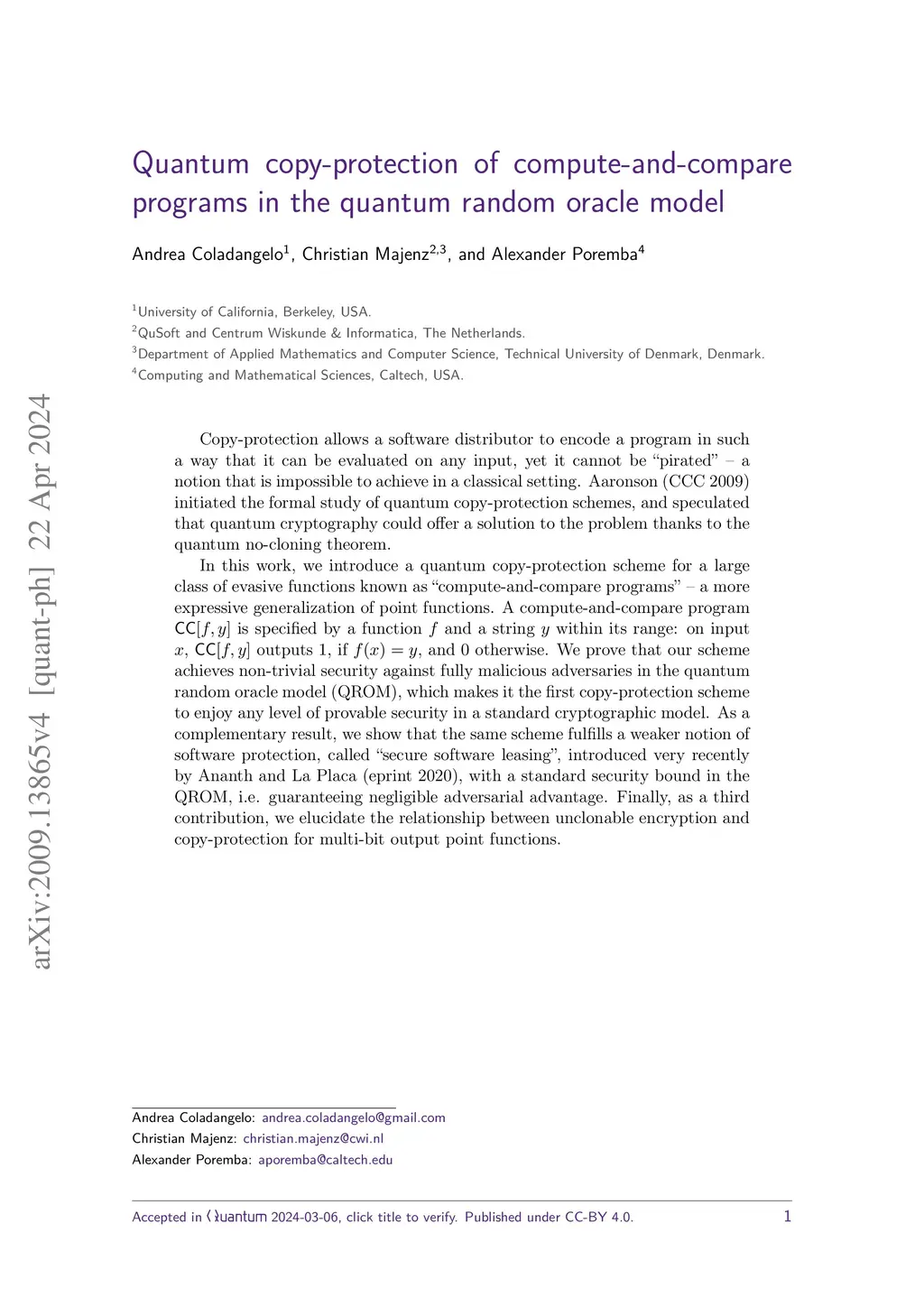 Quantum copy-protection of compute-and-compare programs in the quantum