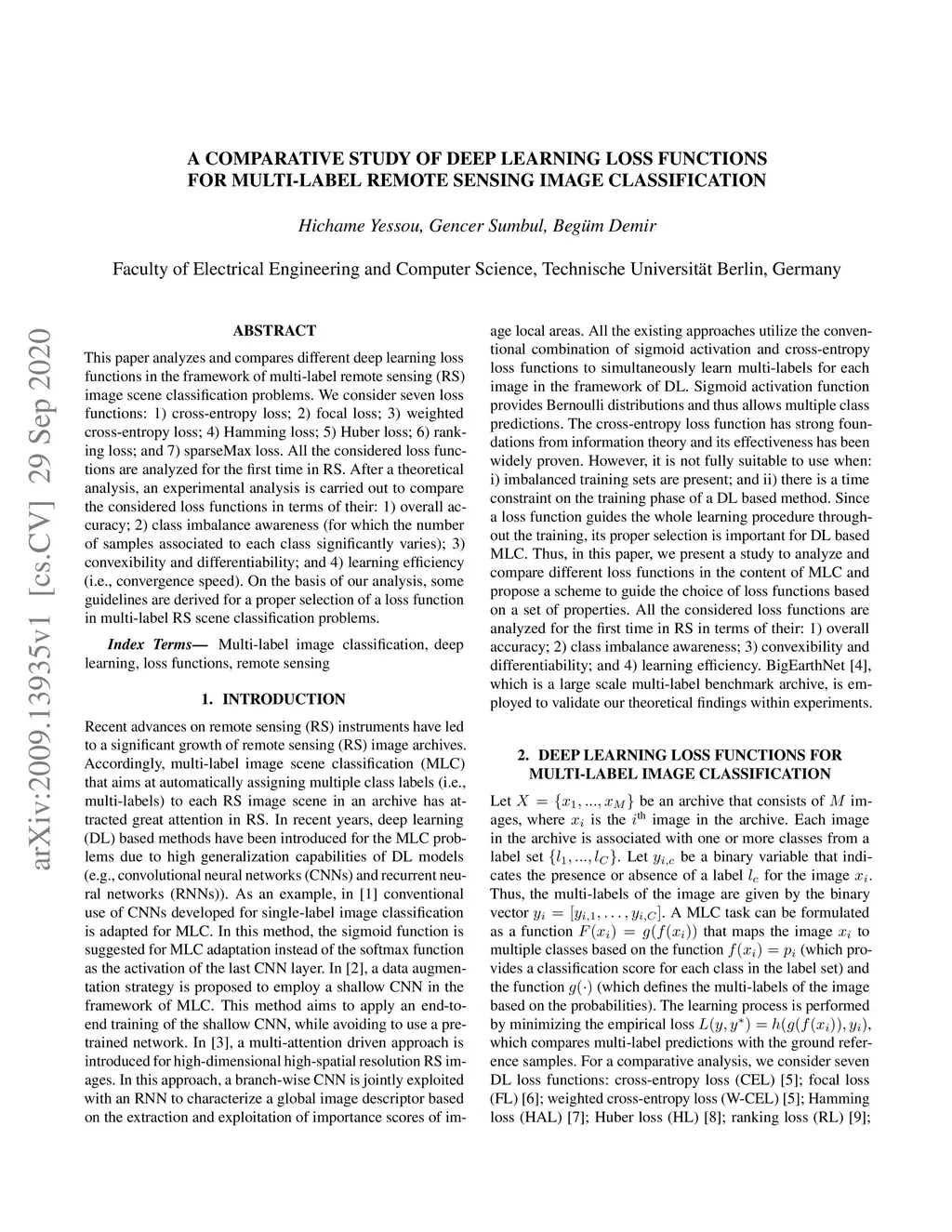 This paper analyzes and compares different deep learning loss functions in the framework of multi-label remote sensing (RS) image scene classification problems. We consider seven loss functions: 1) cross-entropy loss; 2) focal loss; 3) weighted cross-entropy loss; 4) Hamming loss; 5) Huber loss; 6) ranking loss; and 7) sparseMax loss. All the considered loss functions are analyzed for the first time in RS. After a theoretical analysis, an experimental analysis is carried out to compare the considered loss functions in terms of their: 1) overall accuracy; 2) class imbalance awareness (for which the number of samples associated to each class significantly varies); 3) convexibility and differentiability; and 4) learning efficiency (i.e., convergence speed). On the basis of our analysis, some guidelines are derived for a proper selection of a loss function in multi-label RS scene classification problems.