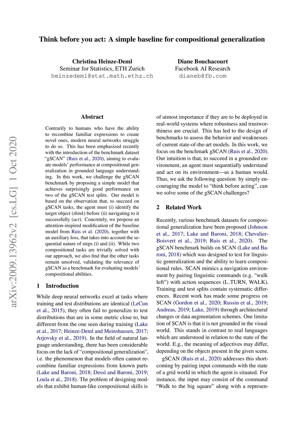 Contrarily to humans who have the ability to recombine familiar expressions to create novel ones, modern neural networks struggle to do so. This has been emphasized recently with the introduction of the benchmark dataset "gSCAN" (Ruis et al. 2020), aiming to evaluate models' performance at compositional generalization in grounded language understanding. In this work, we challenge the gSCAN benchmark by proposing a simple model that achieves surprisingly good performance on two of the gSCAN test splits. Our model is based on the observation that, to succeed on gSCAN tasks, the agent must (i) identify the target object (think) before (ii) navigating to it successfully (act). Concretely, we propose an attention-inspired modification of the baseline model from (Ruis et al. 2020), together with an auxiliary loss, that takes into account the sequential nature of steps (i) and (ii). While two compositional tasks are trivially solved with our approach, we also find that the other tasks remain unsolved, validating the relevance of gSCAN as a benchmark for evaluating models' compositional abilities.