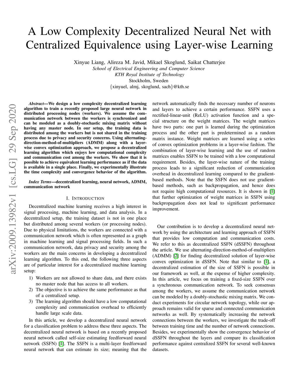 We design a low complexity decentralized learning algorithm to train a recently proposed large neural network in distributed processing nodes (workers). We assume the communication network between the workers is synchronized and can be modeled as a doubly-stochastic mixing matrix without having any master node. In our setup, the training data is distributed among the workers but is not shared in the training process due to privacy and security concerns. Using alternating-direction-method-of-multipliers (ADMM) along with a layerwise convex optimization approach, we propose a decentralized learning algorithm which enjoys low computational complexity and communication cost among the workers. We show that it is possible to achieve equivalent learning performance as if the data is available in a single place. Finally, we experimentally illustrate the time complexity and convergence behavior of the algorithm.