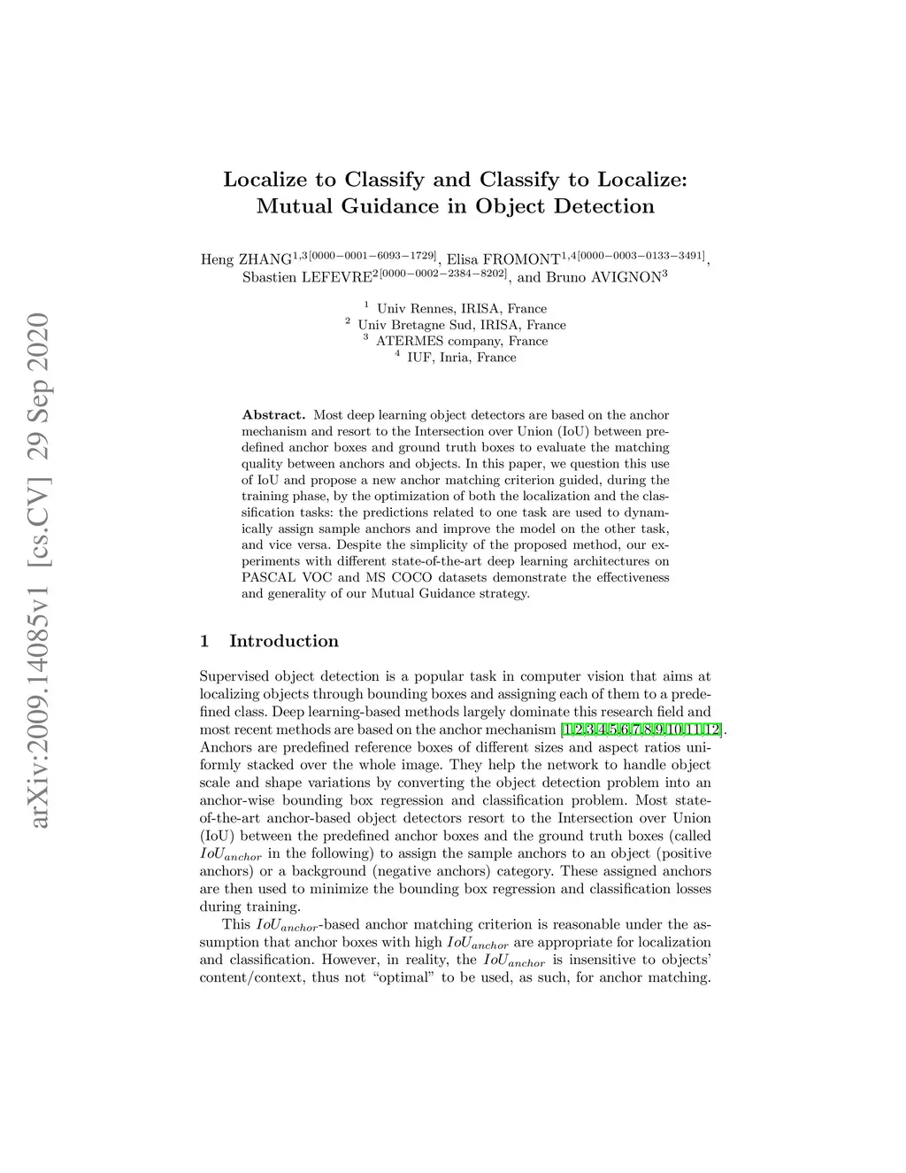 Most deep learning object detectors are based on the anchor mechanism and resort to the Intersection over Union (IoU) between predefined anchor boxes and ground truth boxes to evaluate the matching quality between anchors and objects. In this paper, we question this use of IoU and propose a new anchor matching criterion guided, during the training phase, by the optimization of both the localization and the classification tasks: the predictions related to one task are used to dynamically assign sample anchors and improve the model on the other task, and vice versa. Despite the simplicity of the proposed method, our experiments with different state-of-the-art deep learning architectures on PASCAL VOC and MS COCO datasets demonstrate the effectiveness and generality of our Mutual Guidance strategy.