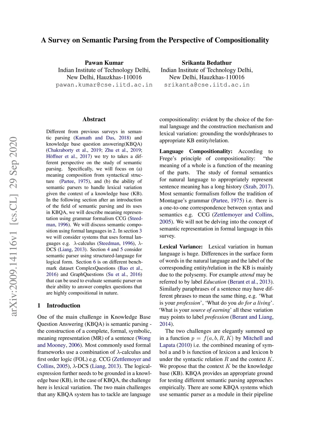 Different from previous surveys in semantic parsing (Kamath and Das, 2018) and knowledge base question answering(KBQA)(Chakraborty et al., 2019; Zhu et al., 2019; Hoffner et al., 2017) we try to takes a different perspective on the study of semantic parsing. Specifically, we will focus on (a)meaning composition from syntactical structure(Partee, 1975), and (b) the ability of semantic parsers to handle lexical variation given the context of a knowledge base (KB). In the following section after an introduction of the field of semantic parsing and its uses in KBQA, we will describe meaning representation using grammar formalism CCG (Steedman, 1996). We will discuss semantic composition using formal languages in Section 2. In section 3 we will consider systems that uses formal languages e.g. -calculus (Steedman, 1996), -DCS (Liang, 2013). Section 4 and 5 consider semantic parser using structured-language for logical form. Section 6 is on different benchmark datasets ComplexQuestions (Bao et al.,2016) and GraphQuestions (Su et al., 2016) that can be used to evaluate semantic parser on their ability to answer complex questions that are highly compositional in nature.