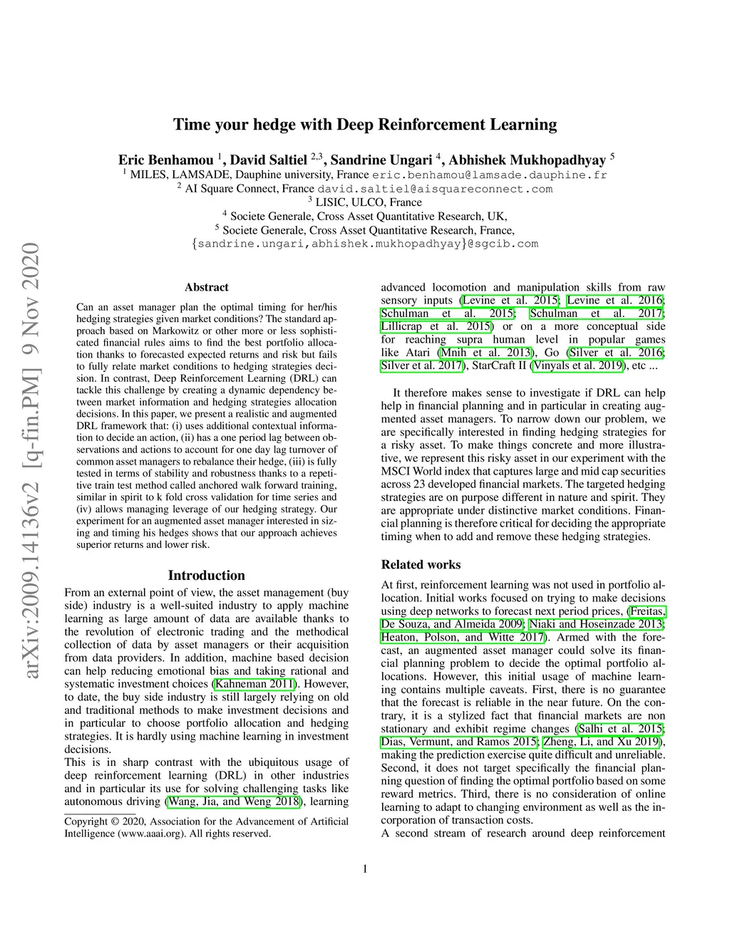 Can an asset manager plan the optimal timing for her/his hedging strategies given market conditions? The standard approach based on Markowitz or other more or less sophisticated financial rules aims to find the best portfolio allocation thanks to forecasted expected returns and risk but fails to fully relate market conditions to hedging strategies decision. In contrast, Deep Reinforcement Learning (DRL) can tackle this challenge by creating a dynamic dependency between market information and hedging strategies allocation decisions. In this paper, we present a realistic and augmented DRL framework that: (i) uses additional contextual information to decide an action, (ii) has a one period lag between observations and actions to account for one day lag turnover of common asset managers to rebalance their hedge, (iii) is fully tested in terms of stability and robustness thanks to a repetitive train test method called anchored walk forward training, similar in spirit to k fold cross validation for time series and (iv) allows managing leverage of our hedging strategy. Our experiment for an augmented asset manager interested in sizing and timing his hedges shows that our approach achieves superior returns and lower risk.