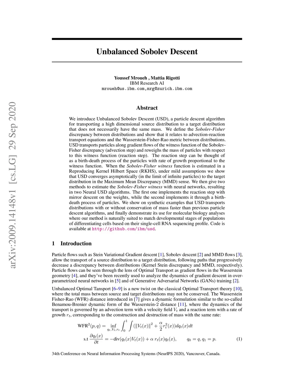 We introduce Unbalanced Sobolev Descent (USD), a particle descent algorithm for transporting a high dimensional source distribution to a target distribution that does not necessarily have the same mass. We define the Sobolev-Fisher discrepancy between distributions and show that it relates to advection-reaction transport equations and the Wasserstein-Fisher-Rao metric between distributions. USD transports particles along gradient flows of the witness function of the Sobolev-Fisher discrepancy (advection step) and reweighs the mass of particles with respect to this witness function (reaction step). The reaction step can be thought of as a birth-death process of the particles with rate of growth proportional to the witness function. When the Sobolev-Fisher witness function is estimated in a Reproducing Kernel Hilbert Space (RKHS), under mild assumptions we show that USD converges asymptotically (in the limit of infinite particles) to the target distribution in the Maximum Mean Discrepancy (MMD) sense. We then give two methods to estimate the Sobolev-Fisher witness with neural networks, resulting in two Neural USD algorithms. The first one implements the reaction step with mirror descent on the weights, while the second implements it through a birth-death process of particles. We show on synthetic examples that USD transports distributions with or without conservation of mass faster than previous particle descent algorithms, and finally demonstrate its use for molecular biology analyses where our method is naturally suited to match developmental stages of populations of differentiating cells based on their single-cell RNA sequencing profile. Code is available at https://github.com/ibm/usd .