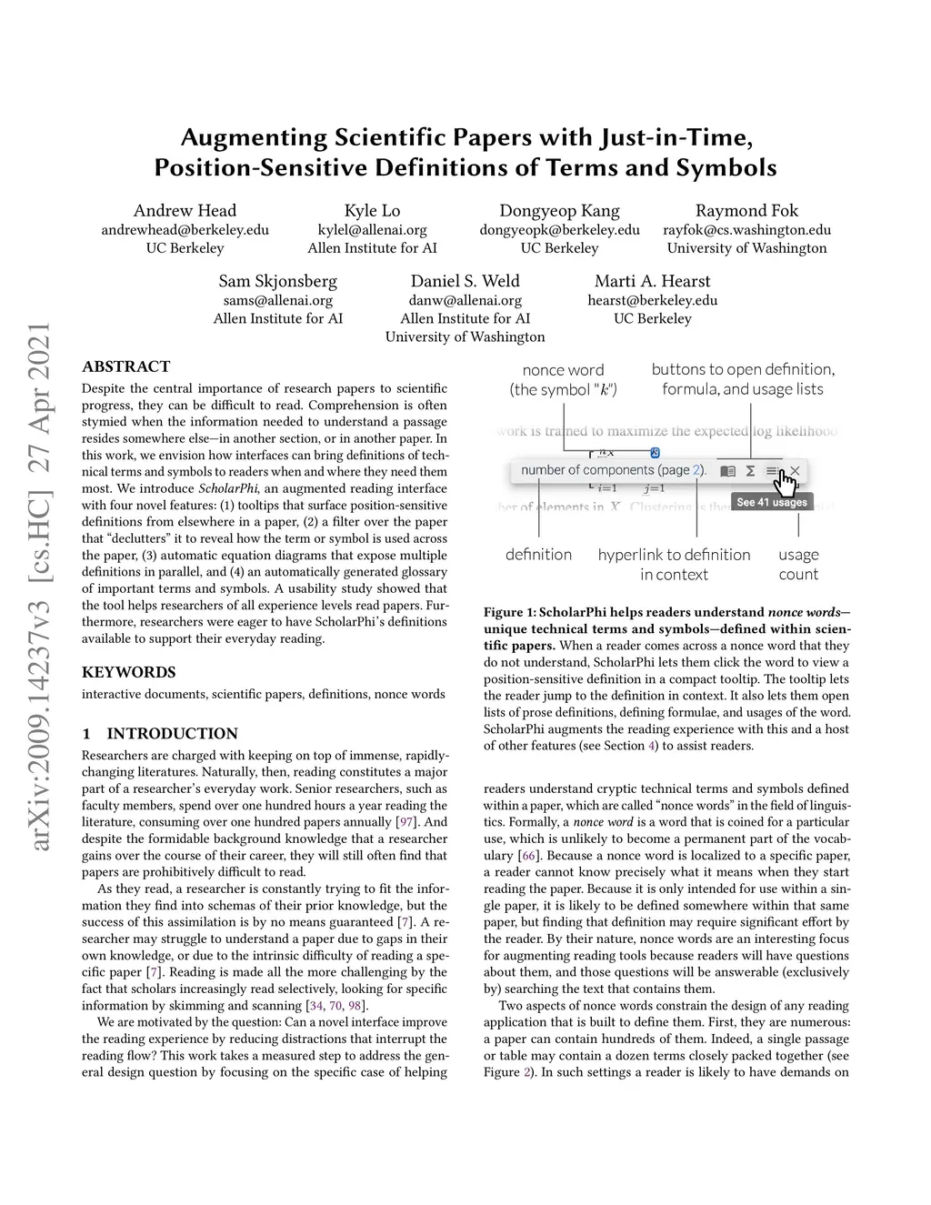 Despite the central importance of research papers to scientific progress, they can be difficult to read. Comprehension is often stymied when the information needed to understand a passage resides somewhere else: in another section, or in another paper. In this work, we envision how interfaces can bring definitions of technical terms and symbols to readers when and where they need them most. We introduce ScholarPhi, an augmented reading interface with four novel features: (1) tooltips that surface position-sensitive definitions from elsewhere in a paper, (2) a filter over the paper that "declutters" it to reveal how the term or symbol is used across the paper, (3) automatic equation diagrams that expose multiple definitions in parallel, and (4) an automatically generated glossary of important terms and symbols. A usability study showed that the tool helps researchers of all experience levels read papers. Furthermore, researchers were eager to have ScholarPhi's definitions available to support their everyday reading.