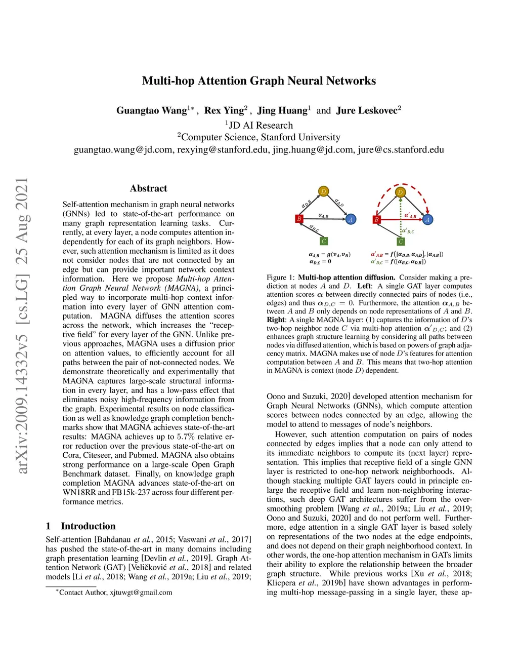 Self-attention mechanism in graph neural networks (GNNs) led to state-of-the-art performance on many graph representation learning tasks. Currently, at every layer, attention is computed between connected pairs of nodes and depends solely on the representation of the two nodes. However, such attention mechanism does not account for nodes that are not directly connected but provide important network context. Here we propose Multi-hop Attention Graph Neural Network (MAGNA), a principled way to incorporate multi-hop context information into every layer of attention computation. MAGNA diffuses the attention scores across the network, which increases the receptive field for every layer of the GNN. Unlike previous approaches, MAGNA uses a diffusion prior on attention values, to efficiently account for all paths between the pair of disconnected nodes. We demonstrate in theory and experiments that MAGNA captures large-scale structural information in every layer, and has a low-pass effect that eliminates noisy high-frequency information from graph data. Experimental results on node classification as well as the knowledge graph completion benchmarks show that MAGNA achieves state-of-the-art results: MAGNA achieves up to 5.7 percent relative error reduction over the previous state-of-the-art on Cora, Citeseer, and Pubmed. MAGNA also obtains the best performance on a large-scale Open Graph Benchmark dataset. On knowledge graph completion MAGNA advances state-of-the-art on WN18RR and FB15k-237 across four different performance metrics.