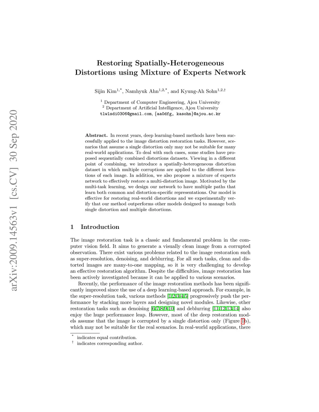 In recent years, deep learning-based methods have been successfully applied to the image distortion restoration tasks. However, scenarios that assume a single distortion only may not be suitable for many real-world applications. To deal with such cases, some studies have proposed sequentially combined distortions datasets. Viewing in a different point of combining, we introduce a spatially-heterogeneous distortion dataset in which multiple corruptions are applied to the different locations of each image. In addition, we also propose a mixture of experts network to effectively restore a multi-distortion image. Motivated by the multi-task learning, we design our network to have multiple paths that learn both common and distortion-specific representations. Our model is effective for restoring real-world distortions and we experimentally verify that our method outperforms other models designed to manage both single distortion and multiple distortions.