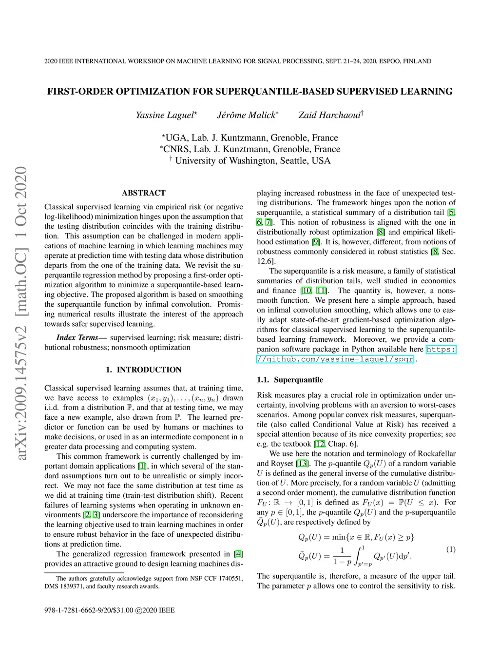 Classical supervised learning via empirical risk (or negative log-likelihood) minimization hinges upon the assumption that the testing distribution coincides with the training distribution. This assumption can be challenged in modern applications of machine learning in which learning machines may operate at prediction time with testing data whose distribution departs from the one of the training data. We revisit the superquantile regression method by proposing a first-order optimization algorithm to minimize a superquantile-based learning objective. The proposed algorithm is based on smoothing the superquantile function by infimal convolution. Promising numerical results illustrate the interest of the approach towards safer supervised learning.