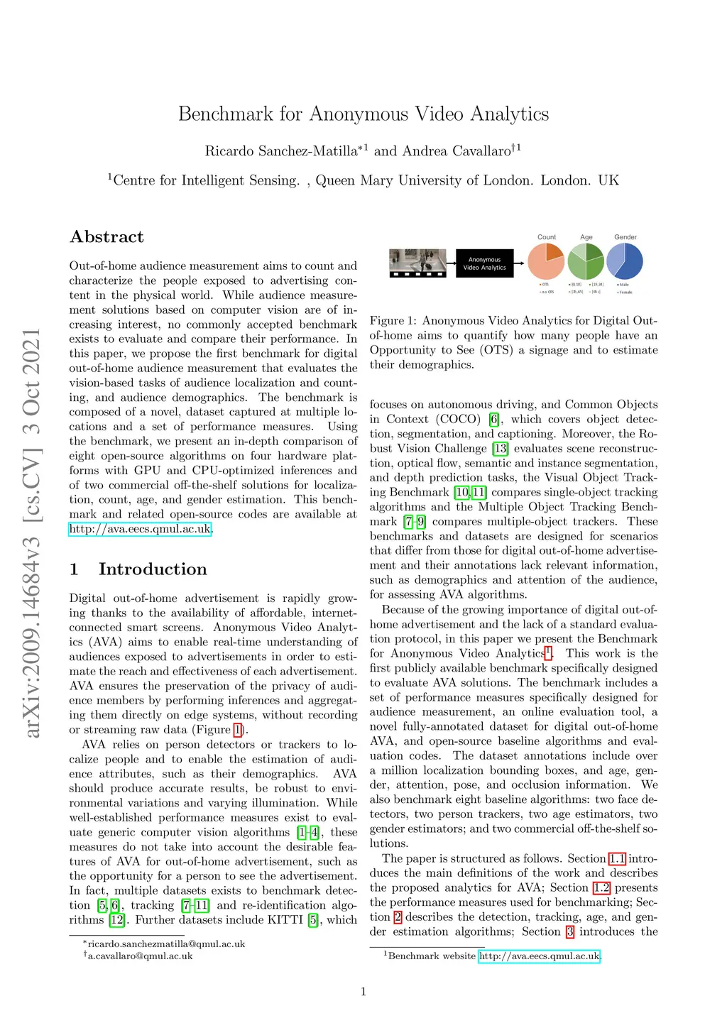 Out-of-home audience measurement aims to count and characterize the people exposed to advertising content in the physical world. While audience measurement solutions based on computer vision are of increasing interest, no commonly accepted benchmark exists to evaluate and compare their performance. In this paper, we propose the first benchmark for digital out-of-home audience measurement that evaluates the vision-based tasks of audience localization and counting, and audience demographics. The benchmark is composed of a novel, dataset captured at multiple locations and a set of performance measures. Using the benchmark, we present an in-depth comparison of eight open-source algorithms on four hardware platforms with GPU and CPU-optimized inferences and of two commercial off-the-shelf solutions for localization, count, age, and gender estimation. This benchmark and related open-source codes are available at http://ava.eecs.qmul.ac.uk.