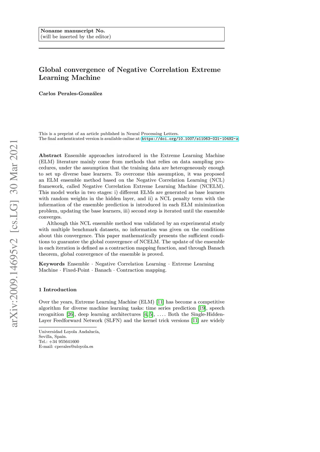 Global convergence of Negative Correlation Extreme Learning Machine