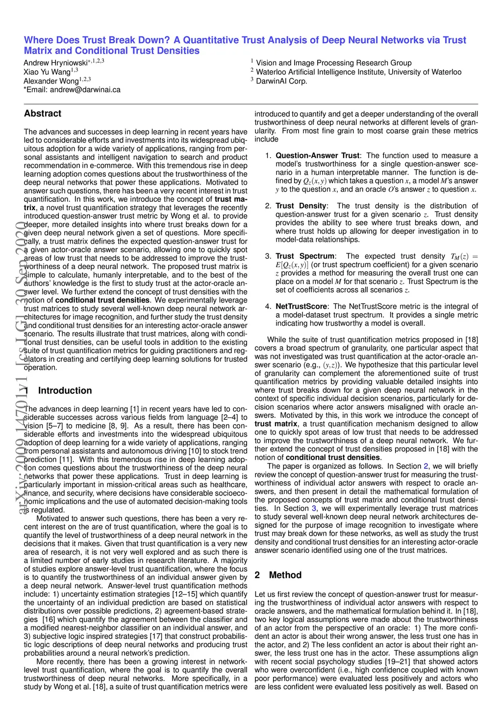 The advances and successes in deep learning in recent years have led to considerable efforts and investments into its widespread ubiquitous adoption for a wide variety of applications, ranging from personal assistants and intelligent navigation to search and product recommendation in e-commerce. With this tremendous rise in deep learning adoption comes questions about the trustworthiness of the deep neural networks that power these applications. Motivated to answer such questions, there has been a very recent interest in trust quantification. In this work, we introduce the concept of trust matrix, a novel trust quantification strategy that leverages the recently introduced question-answer trust metric by Wong et al. to provide deeper, more detailed insights into where trust breaks down for a given deep neural network given a set of questions. More specifically, a trust matrix defines the expected question-answer trust for a given actor-oracle answer scenario, allowing one to quickly spot areas of low trust that needs to be addressed to improve the trustworthiness of a deep neural network. The proposed trust matrix is simple to calculate, humanly interpretable, and to the best of the authors' knowledge is the first to study trust at the actor-oracle answer level. We further extend the concept of trust densities with the notion of conditional trust densities. We experimentally leverage trust matrices to study several well-known deep neural network architectures for image recognition, and further study the trust density and conditional trust densities for an interesting actor-oracle answer scenario. The results illustrate that trust matrices, along with conditional trust densities, can be useful tools in addition to the existing suite of trust quantification metrics for guiding practitioners and regulators in creating and certifying deep learning solutions for trusted operation.