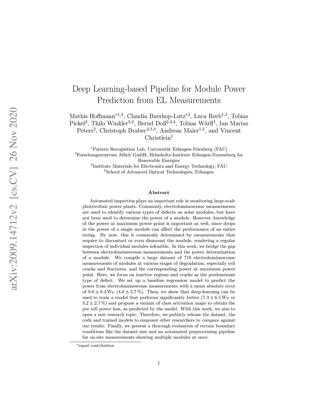 Automated inspection plays an important role in monitoring large-scale photovoltaic power plants. Commonly, electroluminescense measurements are used to identify various types of defects on solar modules but have not been used to determine the power of a module. However, knowledge of the power at maximum power point is important as well, since drops in the power of a single module can affect the performance of an entire string. By now, this is commonly determined by measurements that require to discontact or even dismount the module, rendering a regular inspection of individual modules infeasible. In this work, we bridge the gap between electroluminescense measurements and the power determination of a module. We compile a large dataset of 719 electroluminescense measurementsof modules at various stages of degradation, especially cell cracks and fractures, and the corresponding power at maximum power point. Here,we focus on inactive regions and cracks as the predominant type of defect. We set up a baseline regression model to predict the power from electroluminescense measurements with a mean absolute error of 9.0+/-3.7 (4.0+/-8.4%). Then, we show that deep-learning can be used to train a model that performs significantly better (7.3+/-2.7 or 3.2+/-6.5%) and propose a variant of class activation maps to obtain the per cell power loss, as predicted by the model. With this work, we aim to open a new research topic. Therefore, we publicly release the dataset, the code and trained models to empower other researchers to compare against our results. Finally, we present a thorough evaluation of certain boundary conditions like the dataset size and an automated preprocessing pipeline for on-site measurements showing multiple modules at once.