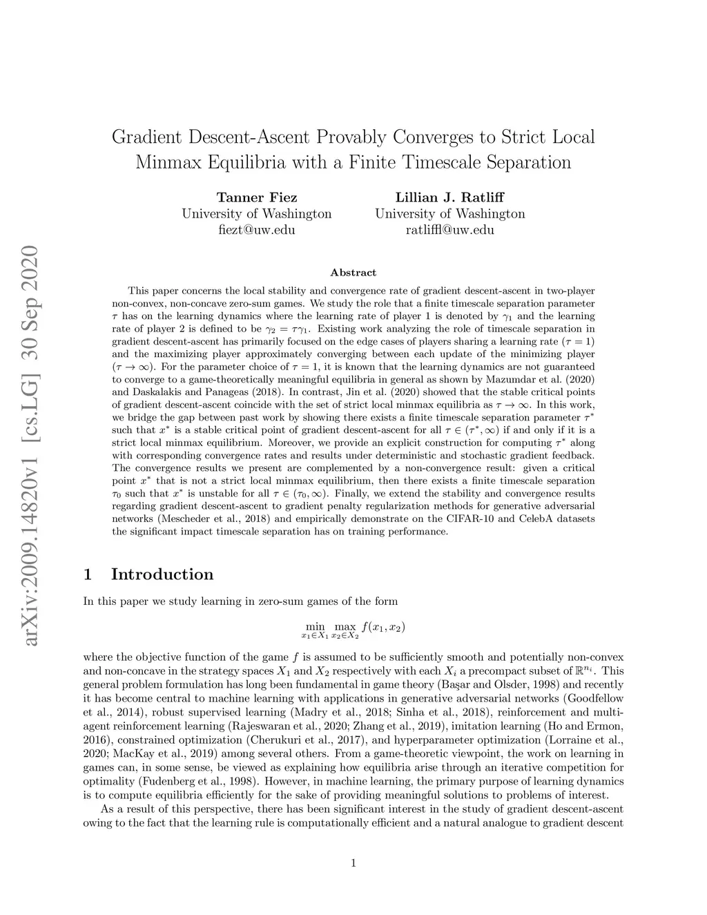 We study the role that a finite timescale separation parameter has on gradient descent-ascent in two-player non-convex, non-concave zero-sum games where the learning rate of player 1 is denoted by and the learning rate of player 2 is defined to be . Existing work analyzing the role of timescale separation in gradient descent-ascent has primarily focused on the edge cases of players sharing a learning rate () and the maximizing player approximately converging between each update of the minimizing player (). For the parameter choice of , it is known that the learning dynamics are not guaranteed to converge to a game-theoretically meaningful equilibria in general. In contrast, Jin et al. (2020) showed that the stable critical points of gradient descent-ascent coincide with the set of strict local minmax equilibria as . In this work, we bridge the gap between past work by showing there exists a finite timescale separation parameter such that is a stable critical point of gradient descent-ascent for all if and only if it is a strict local minmax equilibrium. Moreover, we provide an explicit construction for computing along with corresponding convergence rates and results under deterministic and stochastic gradient feedback. The convergence results we present are complemented by a non-convergence result: given a critical point that is not a strict local minmax equilibrium, then there exists a finite timescale separation such that is unstable for all . Finally, we empirically demonstrate on the CIFAR-10 and CelebA datasets the significant impact timescale separation has on training performance.