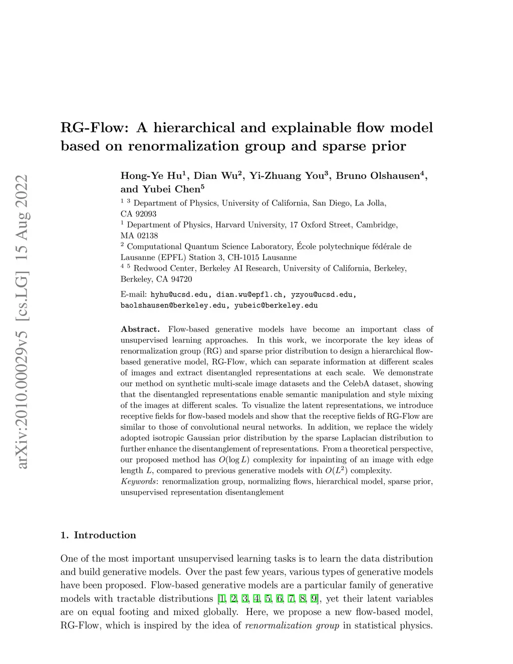 Flow-based generative models have become an important class of unsupervised learning approaches. In this work, we incorporate the key ideas of renormalization group (RG) and sparse prior distribution to design a hierarchical flow-based generative model, RG-Flow, which can separate information at different scales of images and extract disentangled representations at each scale. We demonstrate our method on synthetic multi-scale image datasets and the CelebA dataset, showing that the disentangled representations enable semantic manipulation and style mixing of the images at different scales. To visualize the latent representations, we introduce receptive fields for flow-based models and show that the receptive fields of RG-Flow are similar to those of convolutional neural networks. In addition, we replace the widely adopted isotropic Gaussian prior distribution by the sparse Laplacian distribution to further enhance the disentanglement of representations. From a theoretical perspective, our proposed method has complexity for inpainting of an image with edge length , compared to previous generative models with complexity.
