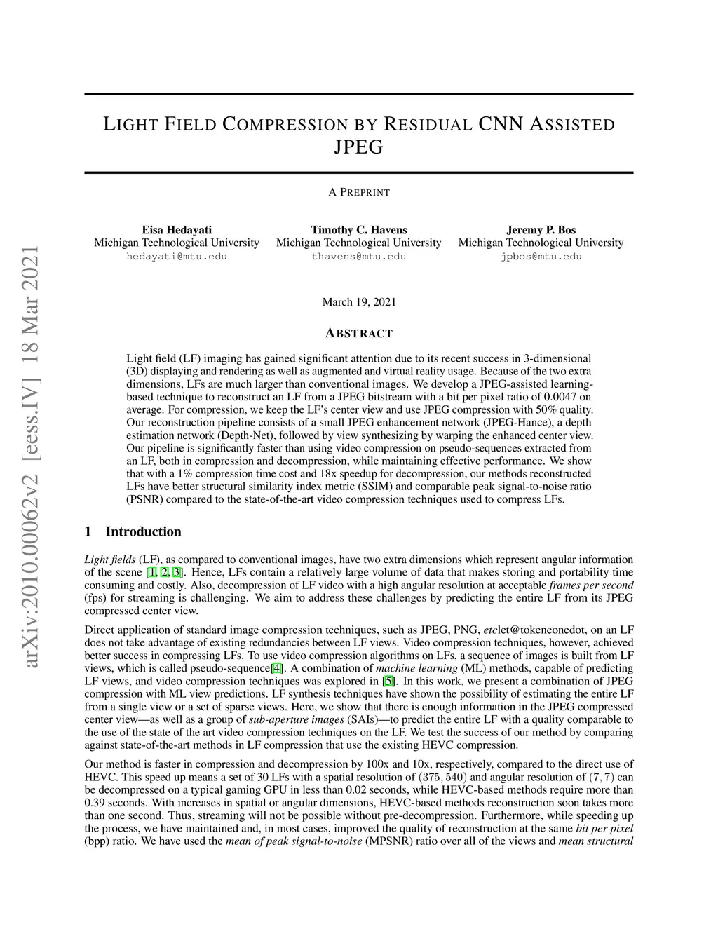 Light field (LF) imaging has gained significant attention due to its recent success in 3-dimensional (3D) displaying and rendering as well as augmented and virtual reality usage. Nonetheless, because of the two extra dimensions, LFs are much larger than conventional images. We develop a JPEG-assisted learning-based technique to reconstruct an LF from a JPEG bitstream with a bit per pixel ratio of 0.0047 on average. For compression, we keep the LF's center view and use JPEG compression with 50% quality. Our reconstruction pipeline consists of a small JPEG enhancement network (JPEG-Hance), a depth estimation network (Depth-Net), followed by view synthesizing by warping the enhanced center view. Our pipeline is significantly faster than using video compression on pseudo-sequences extracted from an LF, both in compression and decompression, while maintaining effective performance. We show that with a 1% compression time cost and 18x speedup for decompression, our methods reconstructed LFs have better structural similarity index metric (SSIM) and comparable peak signal-to-noise ratio (PSNR) compared to the state-of-the-art video compression techniques used to compress LFs.