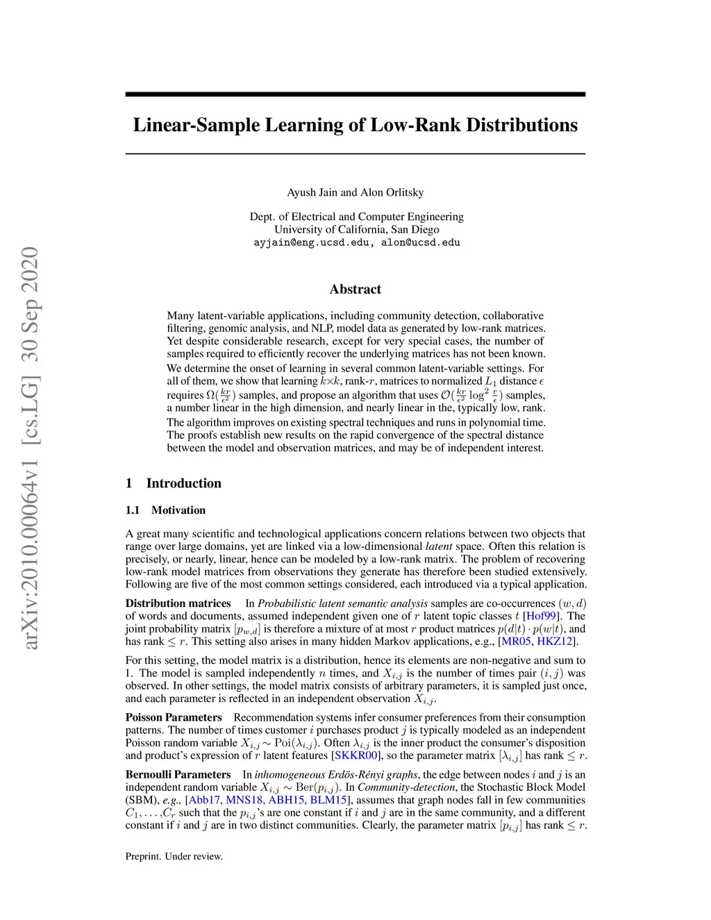 Many latent-variable applications, including community detection, collaborative filtering, genomic analysis, and NLP, model data as generated by low-rank matrices. Yet despite considerable research, except for very special cases, the number of samples required to efficiently recover the underlying matrices has not been known. We determine the onset of learning in several common latent-variable settings. For all of them, we show that learning , rank-, matrices to normalized distance requires samples, and propose an algorithm that uses samples, a number linear in the high dimension, and nearly linear in the, typically low, rank. The algorithm improves on existing spectral techniques and runs in polynomial time. The proofs establish new results on the rapid convergence of the spectral distance between the model and observation matrices, and may be of independent interest.
