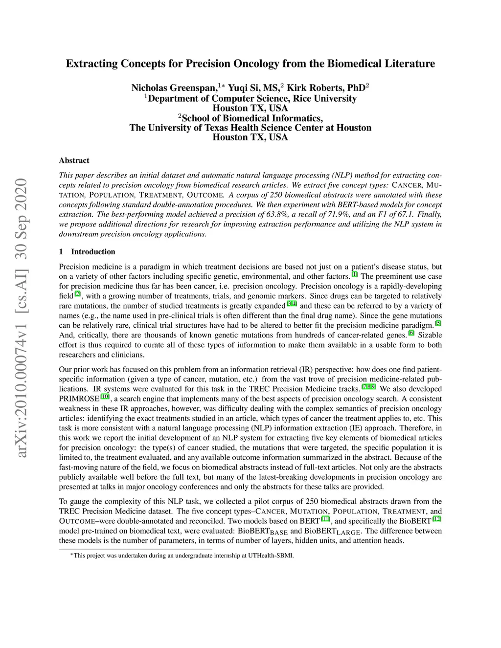 This paper describes an initial dataset and automatic natural language processing (NLP) method for extracting concepts related to precision oncology from biomedical research articles. We extract five concept types: Cancer, Mutation, Population, Treatment, Outcome. A corpus of 250 biomedical abstracts were annotated with these concepts following standard double-annotation procedures. We then experiment with BERT-based models for concept extraction. The best-performing model achieved a precision of 63.8%, a recall of 71.9%, and an F1 of 67.1. Finally, we propose additional directions for research for improving extraction performance and utilizing the NLP system in downstream precision oncology applications.