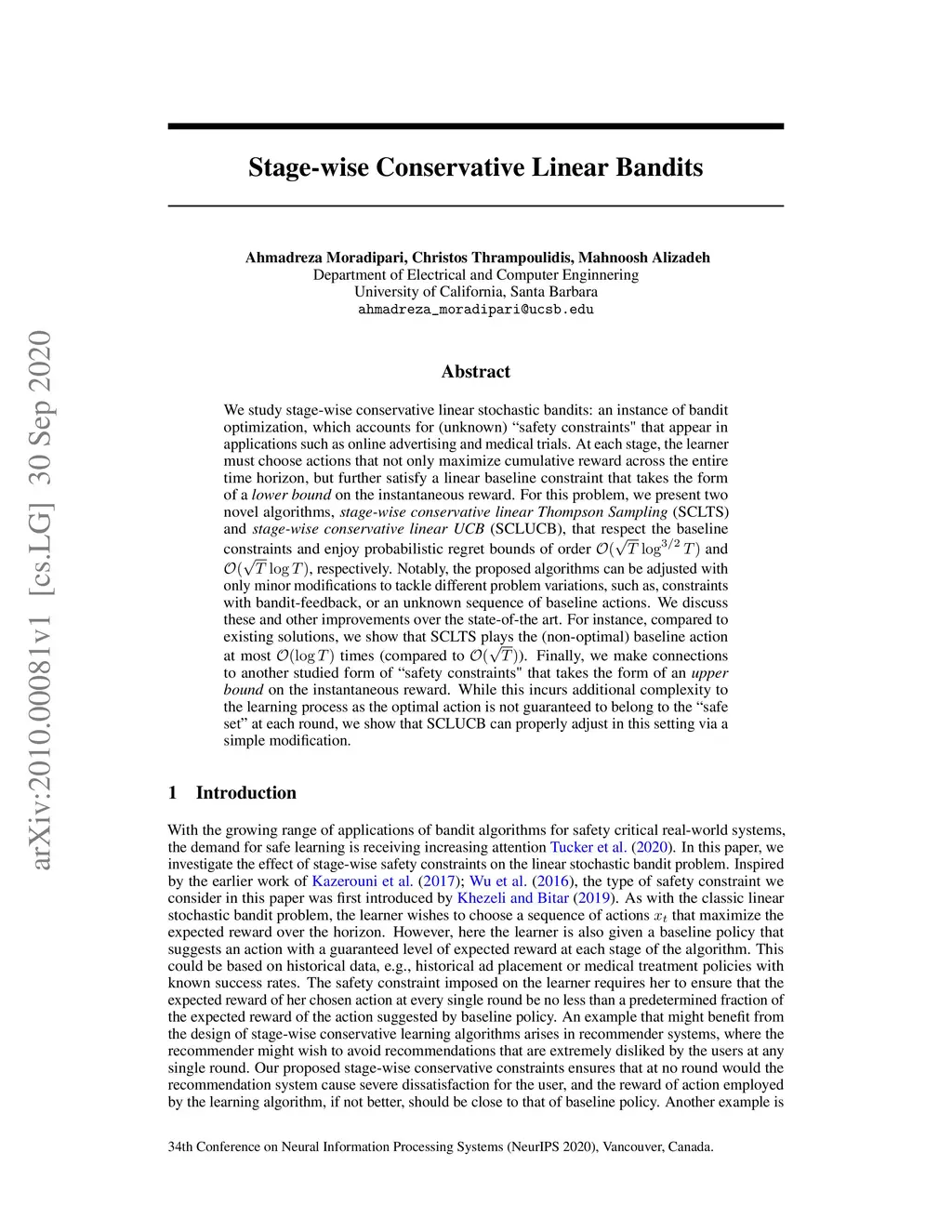 We study stage-wise conservative linear stochastic bandits: an instance of bandit optimization, which accounts for (unknown) safety constraints that appear in applications such as online advertising and medical trials. At each stage, the learner must choose actions that not only maximize cumulative reward across the entire time horizon but further satisfy a linear baseline constraint that takes the form of a lower bound on the instantaneous reward. For this problem, we present two novel algorithms, stage-wise conservative linear Thompson Sampling (SCLTS) and stage-wise conservative linear UCB (SCLUCB), that respect the baseline constraints and enjoy probabilistic regret bounds of order O(\sqrt{T} \log^{3/2}T) and O(\sqrt{T} \log T), respectively. Notably, the proposed algorithms can be adjusted with only minor modifications to tackle different problem variations, such as constraints with bandit-feedback, or an unknown sequence of baseline actions. We discuss these and other improvements over the state-of-the-art. For instance, compared to existing solutions, we show that SCLTS plays the (non-optimal) baseline action at most O(\log{T}) times (compared to O(\sqrt{T})). Finally, we make connections to another studied form of safety constraints that takes the form of an upper bound on the instantaneous reward. While this incurs additional complexity to the learning process as the optimal action is not guaranteed to belong to the safe set at each round, we show that SCLUCB can properly adjust in this setting via a simple modification.