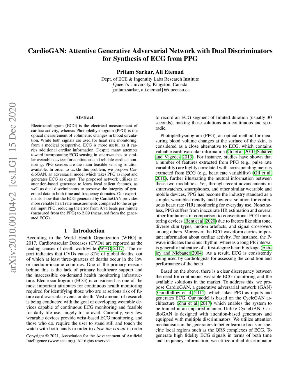 Electrocardiogram (ECG) is the electrical measurement of cardiac activity, whereas Photoplethysmogram (PPG) is the optical measurement of volumetric changes in blood circulation. While both signals are used for heart rate monitoring, from a medical perspective, ECG is more useful as it carries additional cardiac information. Despite many attempts toward incorporating ECG sensing in smartwatches or similar wearable devices for continuous and reliable cardiac monitoring, PPG sensors are the main feasible sensing solution available. In order to tackle this problem, we propose CardioGAN, an adversarial model which takes PPG as input and generates ECG as output. The proposed network utilizes an attention-based generator to learn local salient features, as well as dual discriminators to preserve the integrity of generated data in both time and frequency domains. Our experiments show that the ECG generated by CardioGAN provides more reliable heart rate measurements compared to the original input PPG, reducing the error from 9.74 beats per minute (measured from the PPG) to 2.89 (measured from the generated ECG).