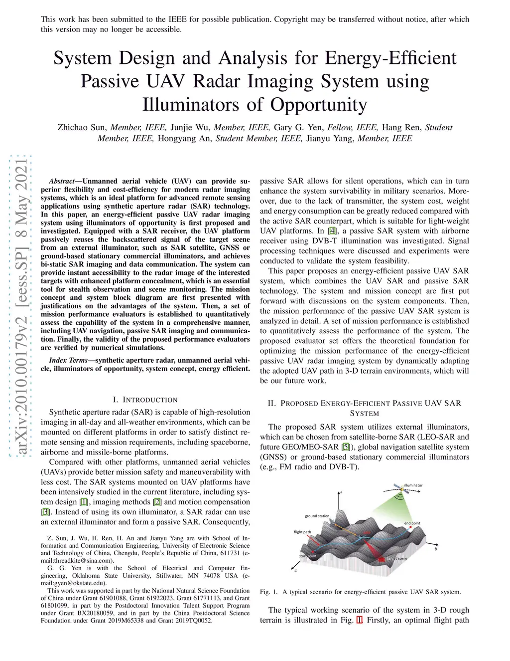 Unmanned ariel vehicle (UAV) can provide superior flexibility and cost-efficiency for modern radar imaging systems, which is an ideal platform for advanced remote sensing applications using synthetic aperture radar (SAR) technology. In this paper, an energy-efficient passive UAV radar imaging system using illuminators of opportunity is first proposed and investigated. Equipped with a SAR receiver, the UAV platform passively reuses the backscattered signal of the target scene from an external illuminator, such as SAR satellite, GNSS or ground-based stationary commercial illuminators, and achieves bi-static SAR imaging and data communication. The system can provide instant accessibility to the radar image of the interested targets with enhanced platform concealment, which is an essential tool for stealth observation and scene monitoring. The mission concept and system block diagram are first presented with justifications on the advantages of the system. Then, the prospective imaging performance and system feasibility are analyzed for the typical illuminators based on signal and spatial resolution model. With different illuminators, the proposed system can achieve distinct imaging performance, which offers more alternatives for various mission requirements. A set of mission performance evaluators is established to quantitatively assess the capability of the system in a comprehensive manner, including UAV navigation, passive SAR imaging and communication. Finally, the validity of the proposed performance evaluators are verified by numerical simulations.