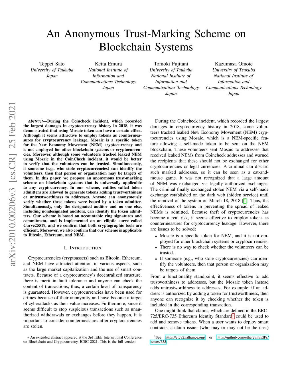 During the Coincheck incident, which recorded the largest damages in cryptocurrency history in 2018, it was demonstrated that using Mosaic token can have a certain effect. Although it seems attractive to employ tokens as countermeasures for cryptocurrency leakage, Mosaic is a specific token for the New Economy Movement (NEM) cryptocurrency and is not employed for other blockchain systems or cryptocurrencies. Moreover, although some volunteers tracked leaked NEM using Mosaic in the CoinCheck incident, it would be better to verify that the volunteers can be trusted. Simultaneously, if someone (e.g., who stole cryptocurrencies) can identify the volunteers, then that person or organization may be targets of them. In this paper, we propose an anonymous trust-marking scheme on blockchain systems that is universally applicable to any cryptocurrency. In our scheme, entities called token admitters are allowed to generate tokens adding trustworthiness or untrustworthiness to addresses. Anyone can anonymously verify whether these tokens were issued by a token admitter. Simultaneously, only the designated auditor and no one else, including nondesignated auditors, can identify the token admitters. Our scheme is based on accountable ring signatures and commitment, and is implemented on an elliptic curve called Curve25519, and we confirm that both cryptographic tools are efficient. Moreover, we also confirm that our scheme is applicable to Bitcoin, Ethereum, and NEM.