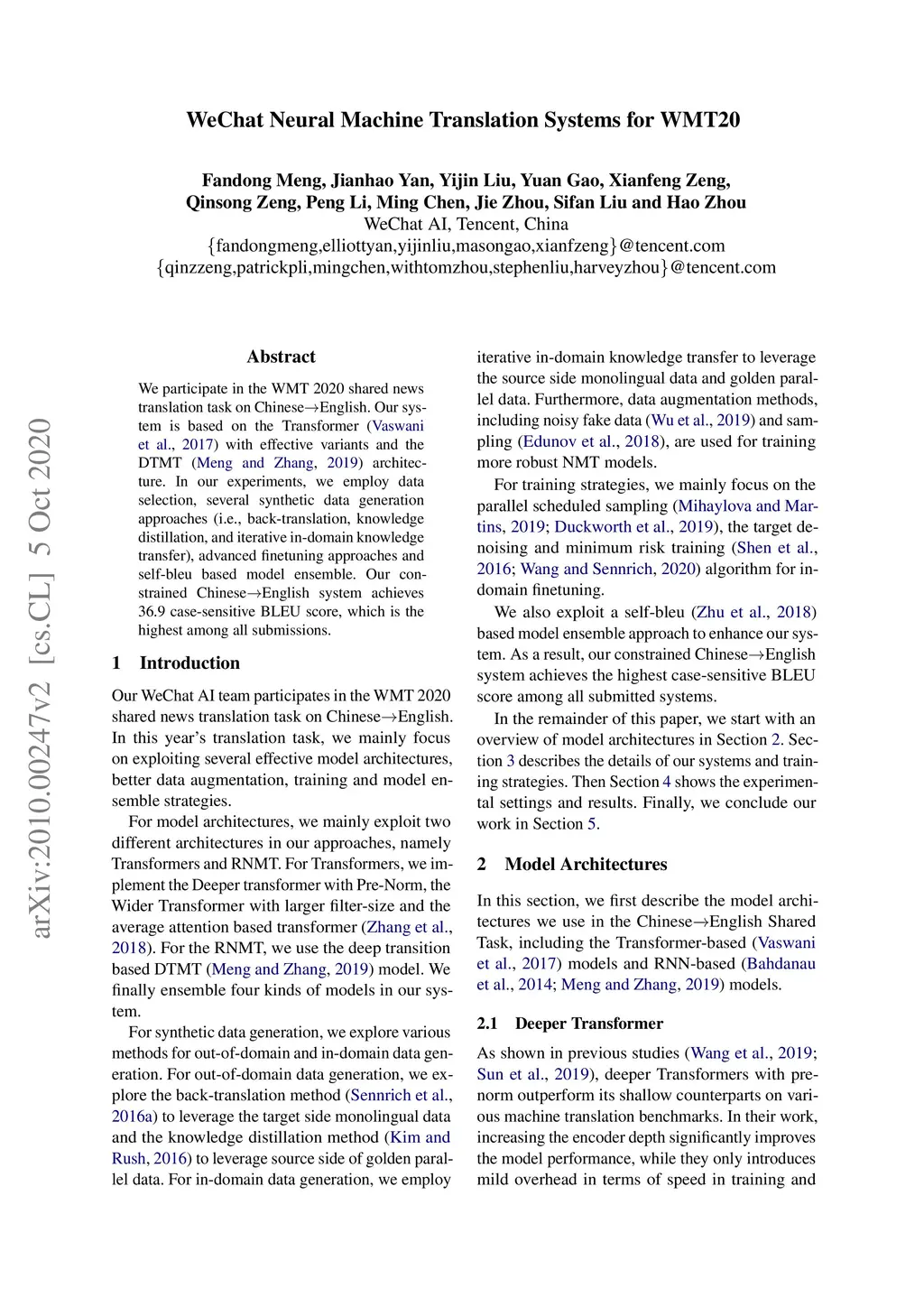 We participate in the WMT 2020 shared news translation task on Chinese to English. Our system is based on the Transformer (Vaswani et al., 2017a) with effective variants and the DTMT (Meng and Zhang, 2019) architecture. In our experiments, we employ data selection, several synthetic data generation approaches (i.e., back-translation, knowledge distillation, and iterative in-domain knowledge transfer), advanced finetuning approaches and self-bleu based model ensemble. Our constrained Chinese to English system achieves 36.9 case-sensitive BLEU score, which is the highest among all submissions.