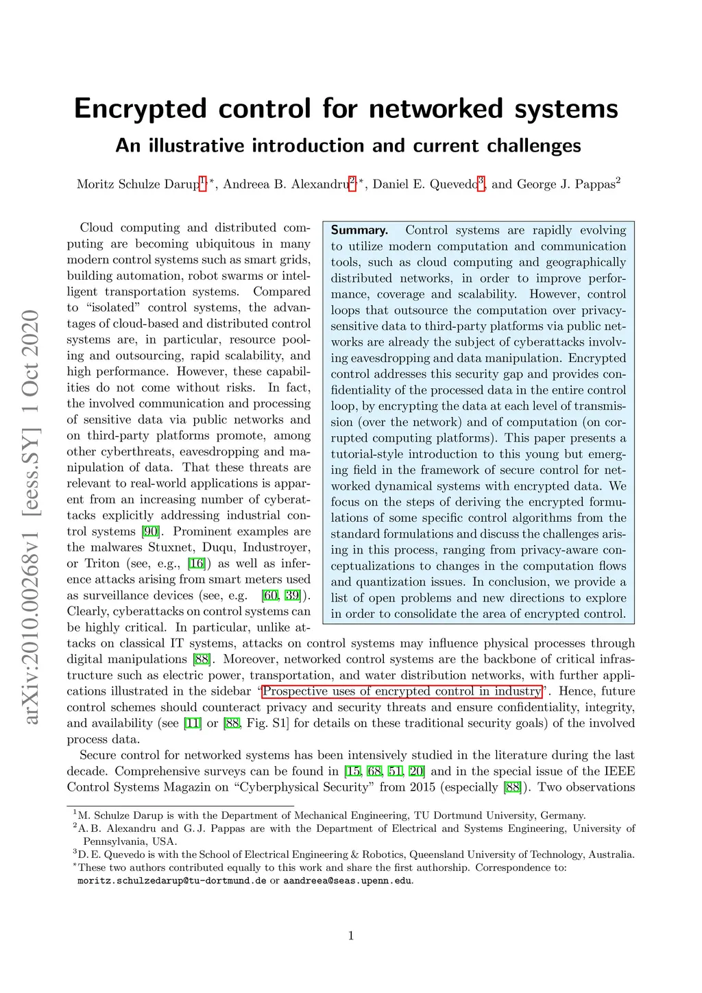 Cloud computing and distributed computing are becoming ubiquitous in many modern control systems such as smart grids, building automation, robot swarms or intelligent transportation systems. Compared to "isolated" control systems, the advantages of cloud-based and distributed control systems are, in particular, resource pooling and outsourcing, rapid scalability, and high performance. However, these capabilities do not come without risks. In fact, the involved communication and processing of sensitive data via public networks and on third-party platforms promote, among other cyberthreats, eavesdropping and manipulation of data. Encrypted control addresses this security gap and provides confidentiality of the processed data in the entire control loop. This paper presents a tutorial-style introduction to this young but emerging field in the framework of secure control for networked dynamical systems.