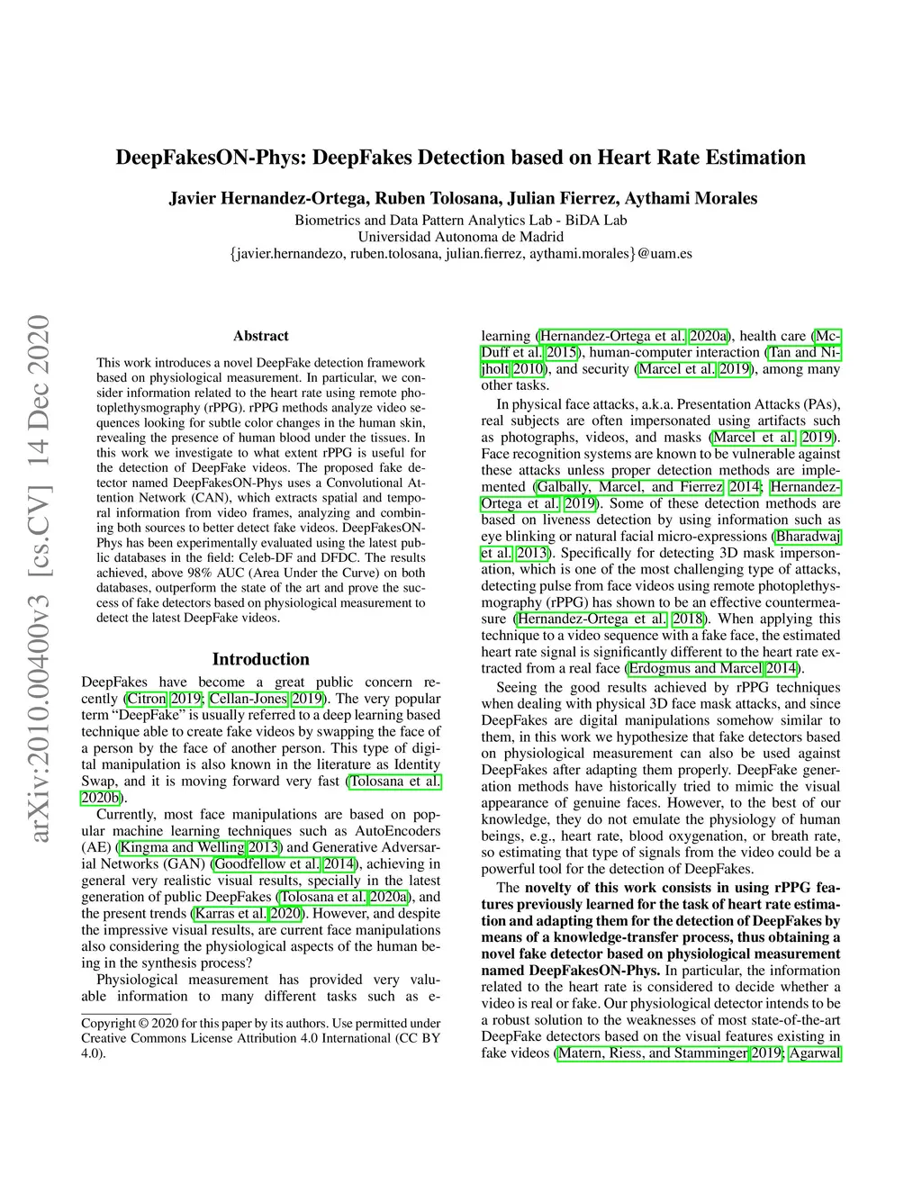 DeepFakesON-Phys: DeepFakes Detection based on Heart Rate Estimation