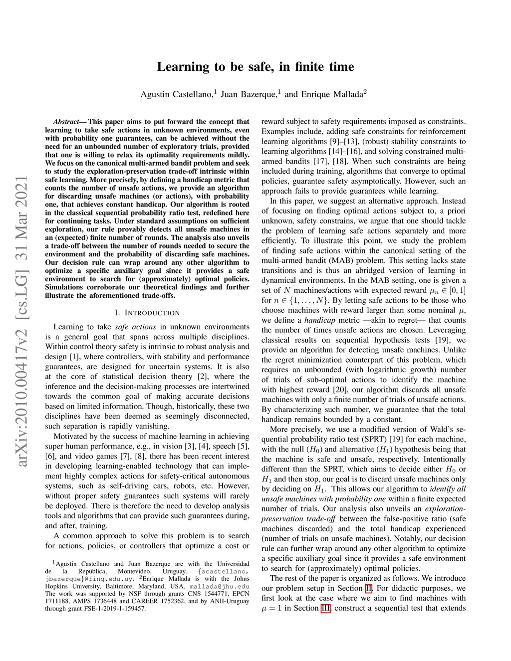 This paper aims to put forward the concept that learning to take safe actions in unknown environments, even with probability one guarantees, can be achieved without the need for an unbounded number of exploratory trials, provided that one is willing to relax its optimality requirements mildly. We focus on the canonical multi-armed bandit problem and seek to study the exploration-preservation trade-off intrinsic within safe learning. More precisely, by defining a handicap metric that counts the number of unsafe actions, we provide an algorithm for discarding unsafe machines (or actions), with probability one, that achieves constant handicap. Our algorithm is rooted in the classical sequential probability ratio test, redefined here for continuing tasks. Under standard assumptions on sufficient exploration, our rule provably detects all unsafe machines in an (expected) finite number of rounds. The analysis also unveils a trade-off between the number of rounds needed to secure the environment and the probability of discarding safe machines. Our decision rule can wrap around any other algorithm to optimize a specific auxiliary goal since it provides a safe environment to search for (approximately) optimal policies. Simulations corroborate our theoretical findings and further illustrate the aforementioned trade-offs.