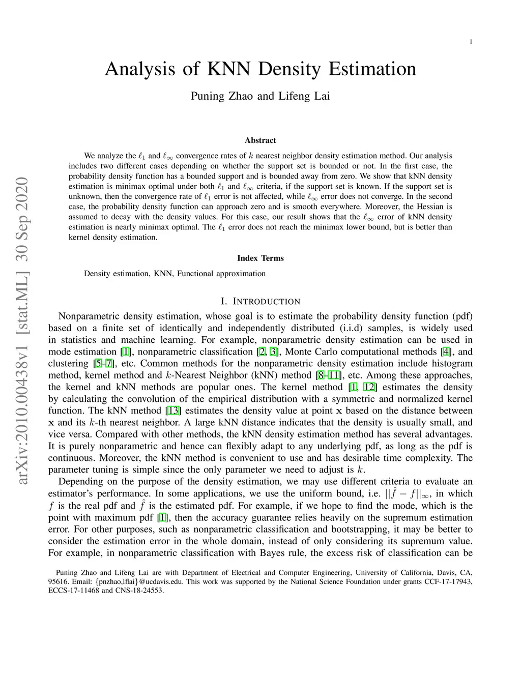 We analyze the and convergence rates of k nearest neighbor density estimation method. Our analysis includes two different cases depending on whether the support set is bounded or not. In the first case, the probability density function has a bounded support and is bounded away from zero. We show that kNN density estimation is minimax optimal under both and criteria, if the support set is known. If the support set is unknown, then the convergence rate of error is not affected, while error does not converge. In the second case, the probability density function can approach zero and is smooth everywhere. Moreover, the Hessian is assumed to decay with the density values. For this case, our result shows that the error of kNN density estimation is nearly minimax optimal. The error does not reach the minimax lower bound, but is better than kernel density estimation.