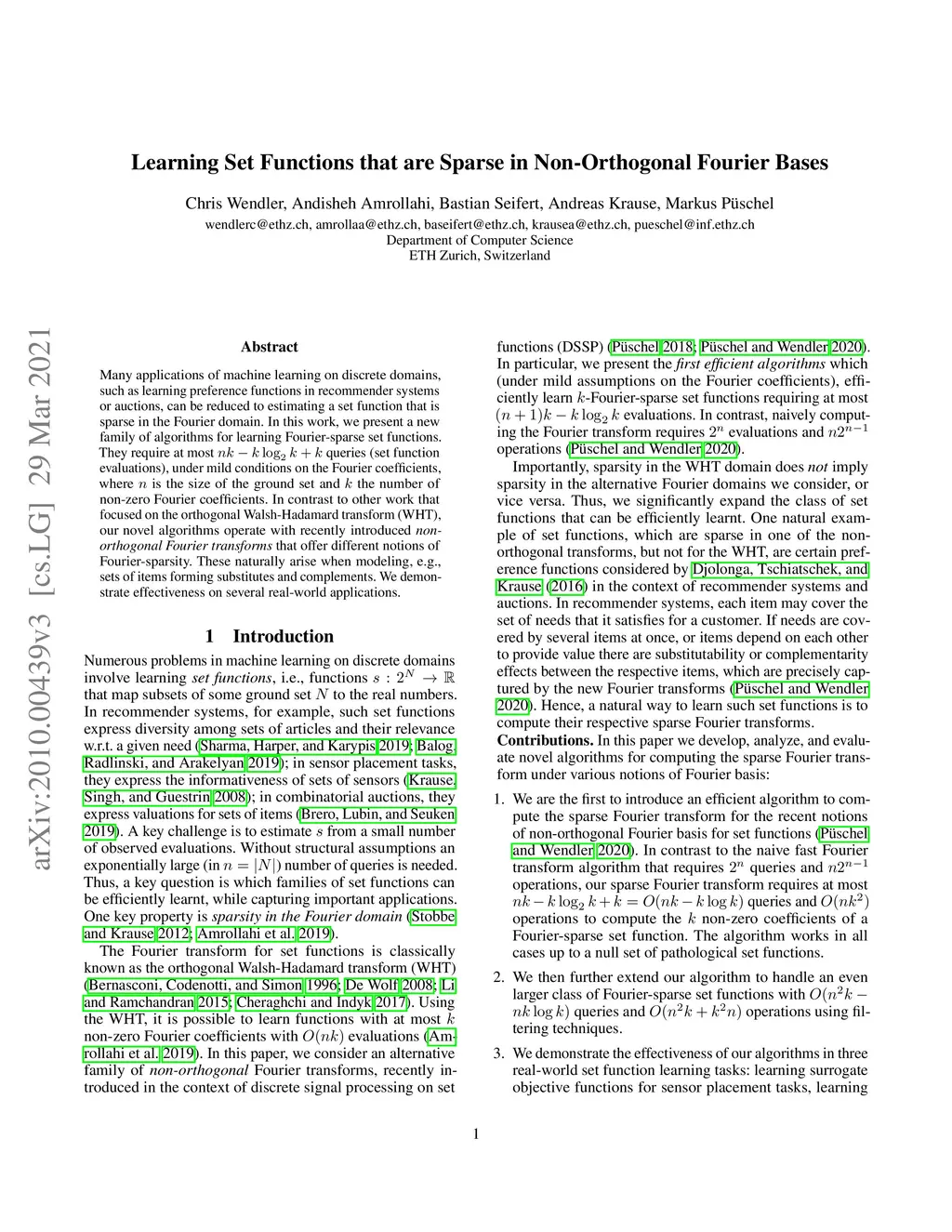 Many applications of machine learning on discrete domains, such as learning preference functions in recommender systems or auctions, can be reduced to estimating a set function that is sparse in the Fourier domain. In this work, we present a new family of algorithms for learning Fourier-sparse set functions. They require at most queries (set function evaluations), under mild conditions on the Fourier coefficients, where is the size of the ground set and the number of non-zero Fourier coefficients. In contrast to other work that focused on the orthogonal Walsh-Hadamard transform, our novel algorithms operate with recently introduced non-orthogonal Fourier transforms that offer different notions of Fourier-sparsity. These naturally arise when modeling, e.g., sets of items forming substitutes and complements. We demonstrate effectiveness on several real-world applications.