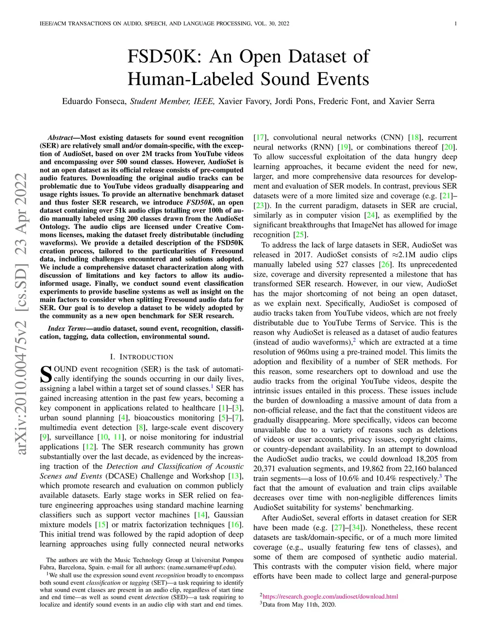 FSD50K: An Open Dataset of Human-Labeled Sound Events