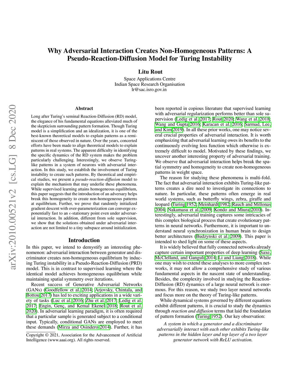 Long after Turing's seminal Reaction-Diffusion (RD) model, the elegance of his fundamental equations alleviated much of the skepticism surrounding pattern formation. Though Turing model is a simplification and an idealization, it is one of the best-known theoretical models to explain patterns as a reminiscent of those observed in nature. Over the years, concerted efforts have been made to align theoretical models to explain patterns in real systems. The apparent difficulty in identifying the specific dynamics of the RD system makes the problem particularly challenging. Interestingly, we observe Turing-like patterns in a system of neurons with adversarial interaction. In this study, we establish the involvement of Turing instability to create such patterns. By theoretical and empirical studies, we present a pseudo-reaction-diffusion model to explain the mechanism that may underlie these phenomena. While supervised learning attains homogeneous equilibrium, this paper suggests that the introduction of an adversary helps break this homogeneity to create non-homogeneous patterns at equilibrium. Further, we prove that randomly initialized gradient descent with over-parameterization can converge exponentially fast to an -stationary point even under adversarial interaction. In addition, different from sole supervision, we show that the solutions obtained under adversarial interaction are not limited to a tiny subspace around initialization.