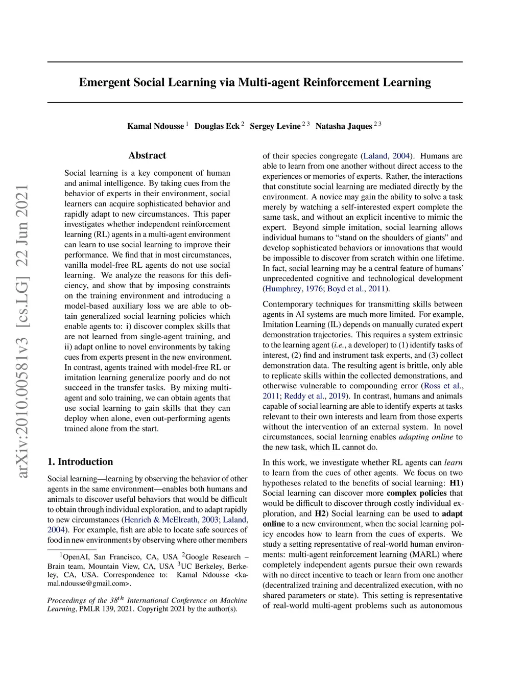 Emergent Social Learning via Multi-agent Reinforcement Learning