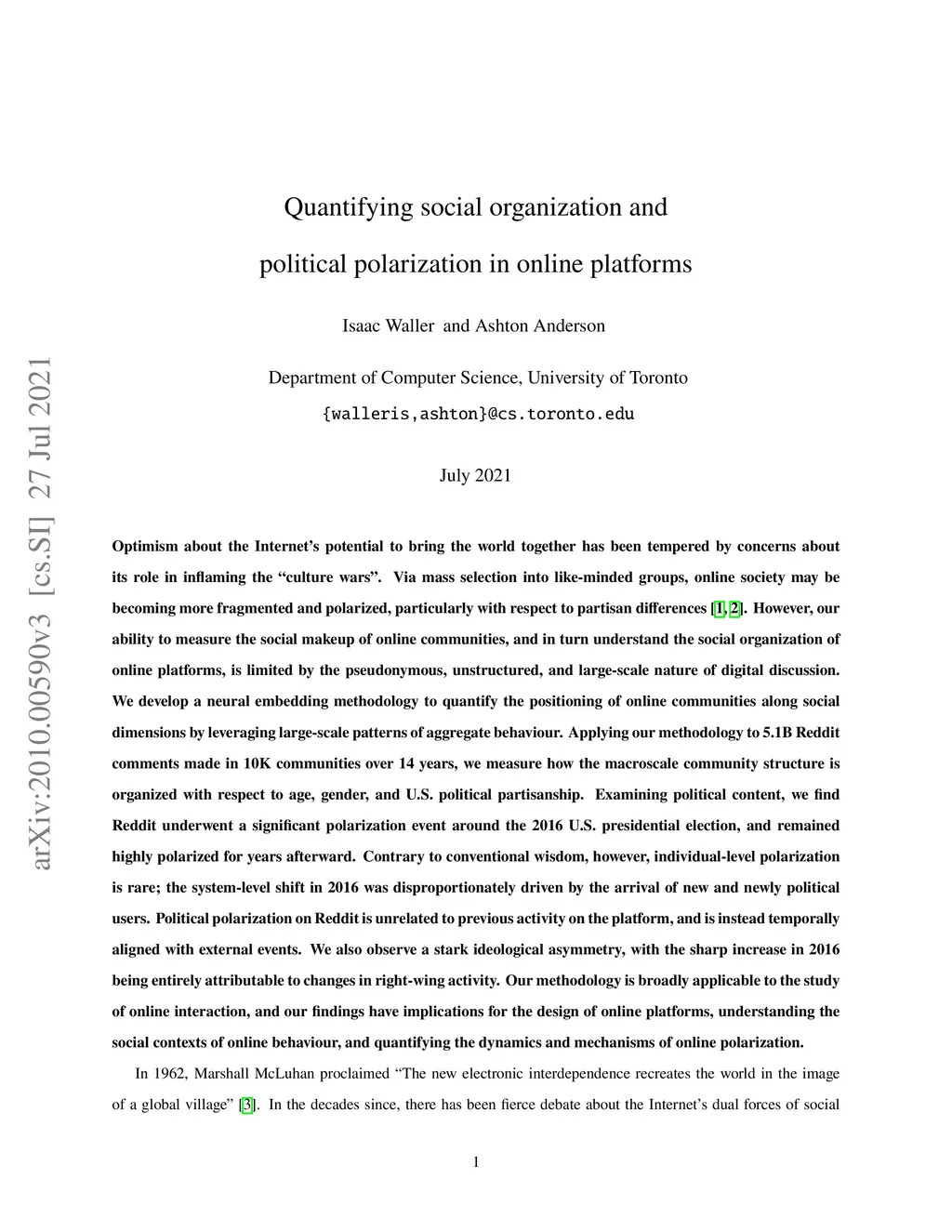 Optimism about the Internet's potential to bring the world together has been tempered by concerns about its role in inflaming the 'culture wars'. Via mass selection into like-minded groups, online society may be becoming more fragmented and polarized, particularly with respect to partisan differences. However, our ability to measure the cultural makeup of online communities, and in turn understand the cultural structure of online platforms, is limited by the pseudonymous, unstructured, and large-scale nature of digital discussion. Here we develop a neural embedding methodology to quantify the positioning of online communities along cultural dimensions by leveraging large-scale patterns of aggregate behaviour. Applying our methodology to 4.8B Reddit comments made in 10K communities over 14 years, we find that the macro-scale community structure is organized along cultural lines, and that relationships between online cultural concepts are more complex than simply reflecting their offline analogues. Examining political content, we show Reddit underwent a significant polarization event around the 2016 U.S. presidential election, and remained highly polarized for years afterward. Contrary to conventional wisdom, however, instances of individual users becoming more polarized over time are rare; the majority of platform-level polarization is driven by the arrival of new and newly political users. Our methodology is broadly applicable to the study of online culture, and our findings have implications for the design of online platforms, understanding the cultural contexts of online content, and quantifying cultural shifts in online behaviour.