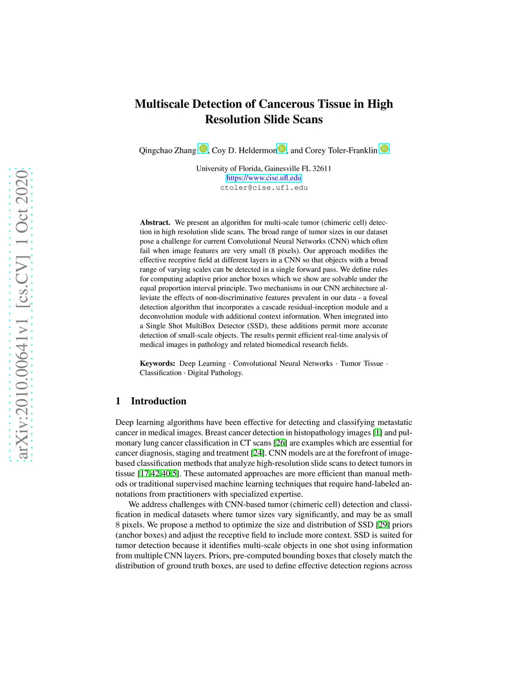 We present an algorithm for multi-scale tumor (chimeric cell) detection in high resolution slide scans. The broad range of tumor sizes in our dataset pose a challenge for current Convolutional Neural Networks (CNN) which often fail when image features are very small (8 pixels). Our approach modifies the effective receptive field at different layers in a CNN so that objects with a broad range of varying scales can be detected in a single forward pass. We define rules for computing adaptive prior anchor boxes which we show are solvable under the equal proportion interval principle. Two mechanisms in our CNN architecture alleviate the effects of non-discriminative features prevalent in our data - a foveal detection algorithm that incorporates a cascade residual-inception module and a deconvolution module with additional context information. When integrated into a Single Shot MultiBox Detector (SSD), these additions permit more accurate detection of small-scale objects. The results permit efficient real-time analysis of medical images in pathology and related biomedical research fields.