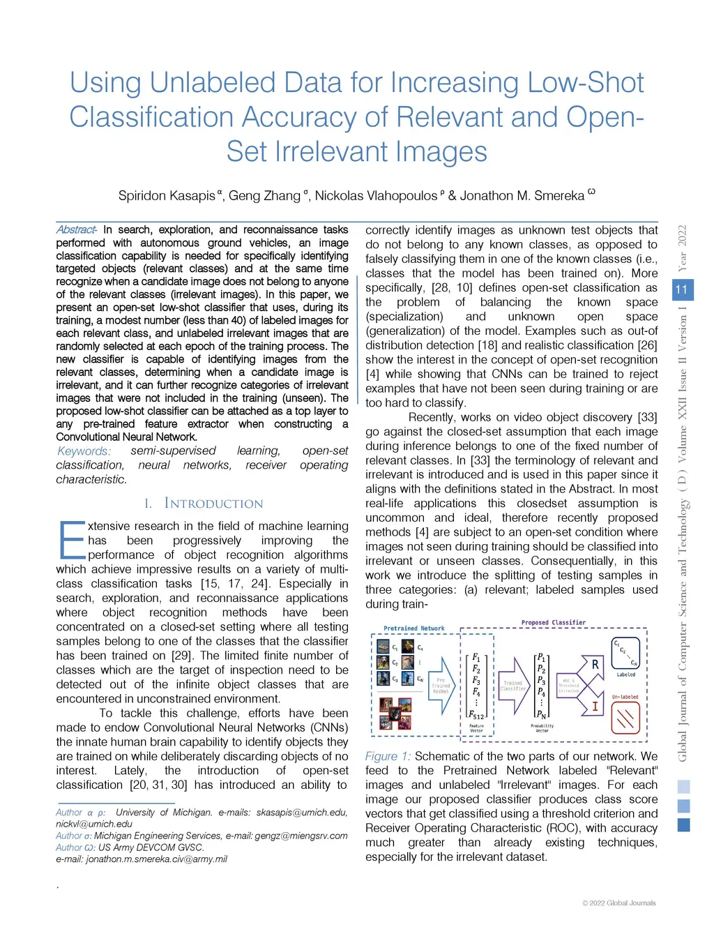In search, exploration, and reconnaissance tasks performed with autonomous ground vehicles, an image classification capability is needed for specifically identifying targeted objects (relevant classes) and at the same time recognize when a candidate image does not belong to anyone of the relevant classes (irrelevant images). In this paper, we present an open-set low-shot classifier that uses, during its training, a modest number (less than 40) of labeled images for each relevant class, and unlabeled irrelevant images that are randomly selected at each epoch of the training process. The new classifier is capable of identifying images from the relevant classes, determining when a candidate image is irrelevant, and it can further recognize categories of irrelevant images that were not included in the training (unseen). The proposed low-shot classifier can be attached as a top layer to any pre-trained feature extractor when constructing a Convolutional Neural Network.