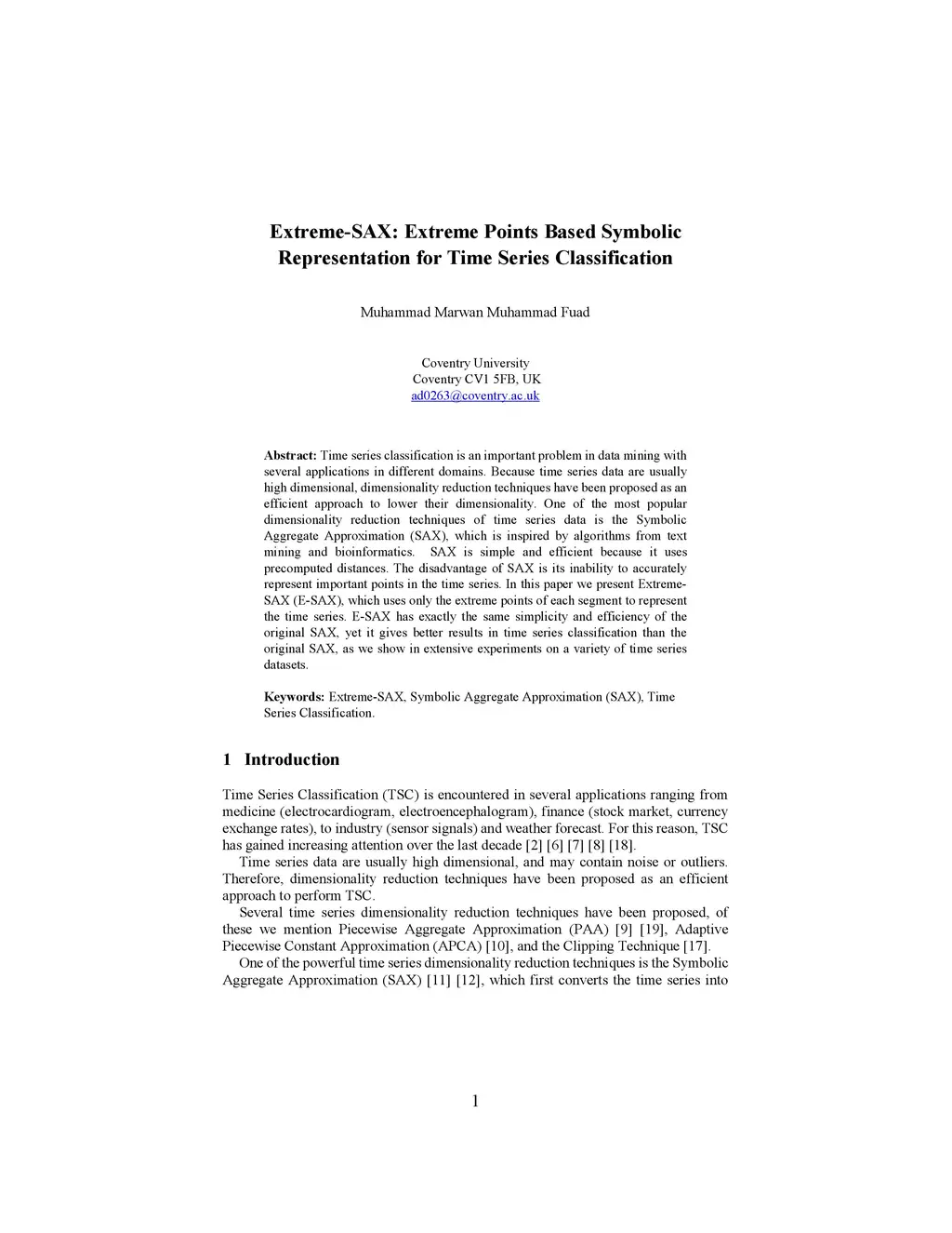 Time series classification is an important problem in data mining with several applications in different domains. Because time series data are usually high dimensional, dimensionality reduction techniques have been proposed as an efficient approach to lower their dimensionality. One of the most popular dimensionality reduction techniques of time series data is the Symbolic Aggregate Approximation (SAX), which is inspired by algorithms from text mining and bioinformatics. SAX is simple and efficient because it uses precomputed distances. The disadvantage of SAX is its inability to accurately represent important points in the time series. In this paper we present Extreme-SAX (E-SAX), which uses only the extreme points of each segment to represent the time series. E-SAX has exactly the same simplicity and efficiency of the original SAX, yet it gives better results in time series classification than the original SAX, as we show in extensive experiments on a variety of time series datasets.