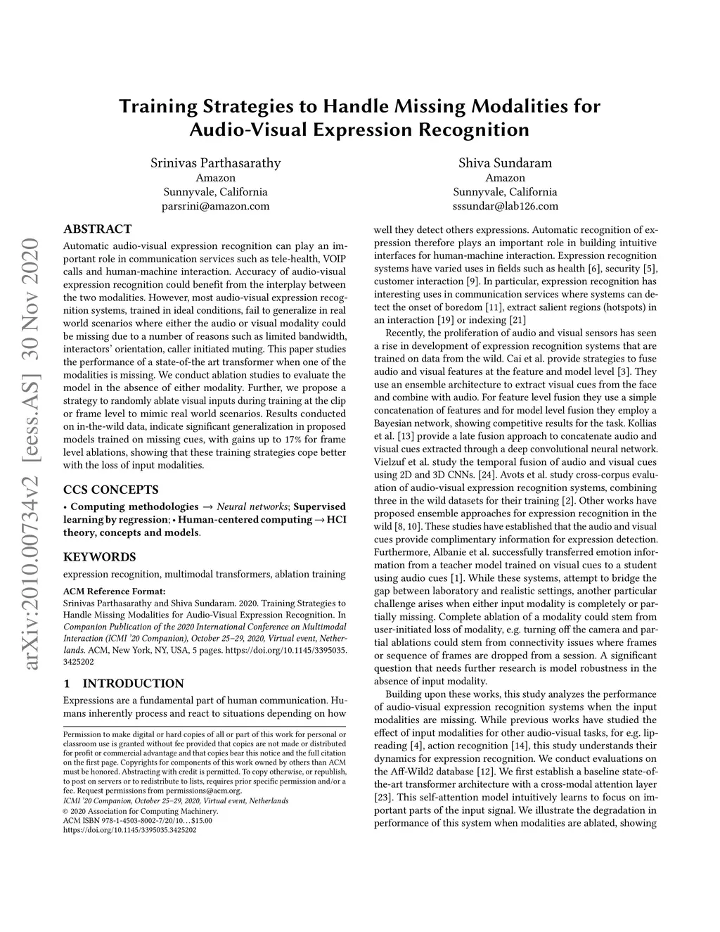 Automatic audio-visual expression recognition can play an important role in communication services such as tele-health, VOIP calls and human-machine interaction. Accuracy of audio-visual expression recognition could benefit from the interplay between the two modalities. However, most audio-visual expression recognition systems, trained in ideal conditions, fail to generalize in real world scenarios where either the audio or visual modality could be missing due to a number of reasons such as limited bandwidth, interactors' orientation, caller initiated muting. This paper studies the performance of a state-of-the art transformer when one of the modalities is missing. We conduct ablation studies to evaluate the model in the absence of either modality. Further, we propose a strategy to randomly ablate visual inputs during training at the clip or frame level to mimic real world scenarios. Results conducted on in-the-wild data, indicate significant generalization in proposed models trained on missing cues, with gains up to 17% for frame level ablations, showing that these training strategies cope better with the loss of input modalities.