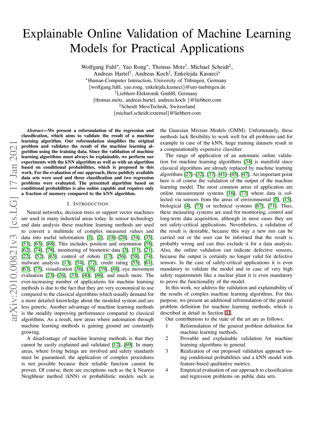 We present a reformulation of the regression and classification, which aims to validate the result of a machine learning algorithm. Our reformulation simplifies the original problem and validates the result of the machine learning algorithm using the training data. Since the validation of machine learning algorithms must always be explainable, we perform our experiments with the kNN algorithm as well as with an algorithm based on conditional probabilities, which is proposed in this work. For the evaluation of our approach, three publicly available data sets were used and three classification and two regression problems were evaluated. The presented algorithm based on conditional probabilities is also online capable and requires only a fraction of memory compared to the kNN algorithm.