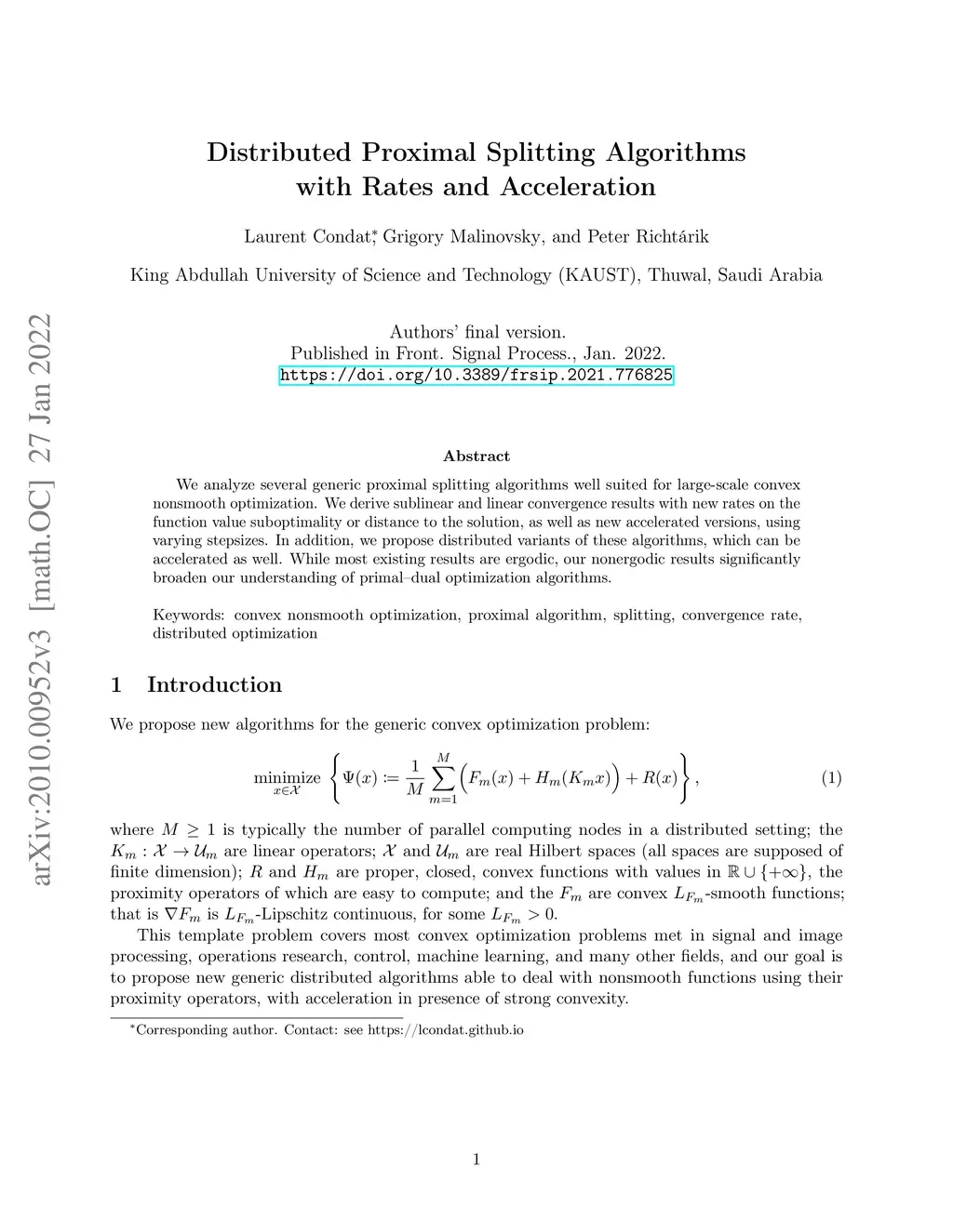We analyze several generic proximal splitting algorithms well suited for large-scale convex nonsmooth optimization. We derive sublinear and linear convergence results with new rates on the function value suboptimality or distance to the solution, as well as new accelerated versions, using varying stepsizes. In addition, we propose distributed variants of these algorithms, which can be accelerated as well. While most existing results are ergodic, our nonergodic results significantly broaden our understanding of primal-dual optimization algorithms.