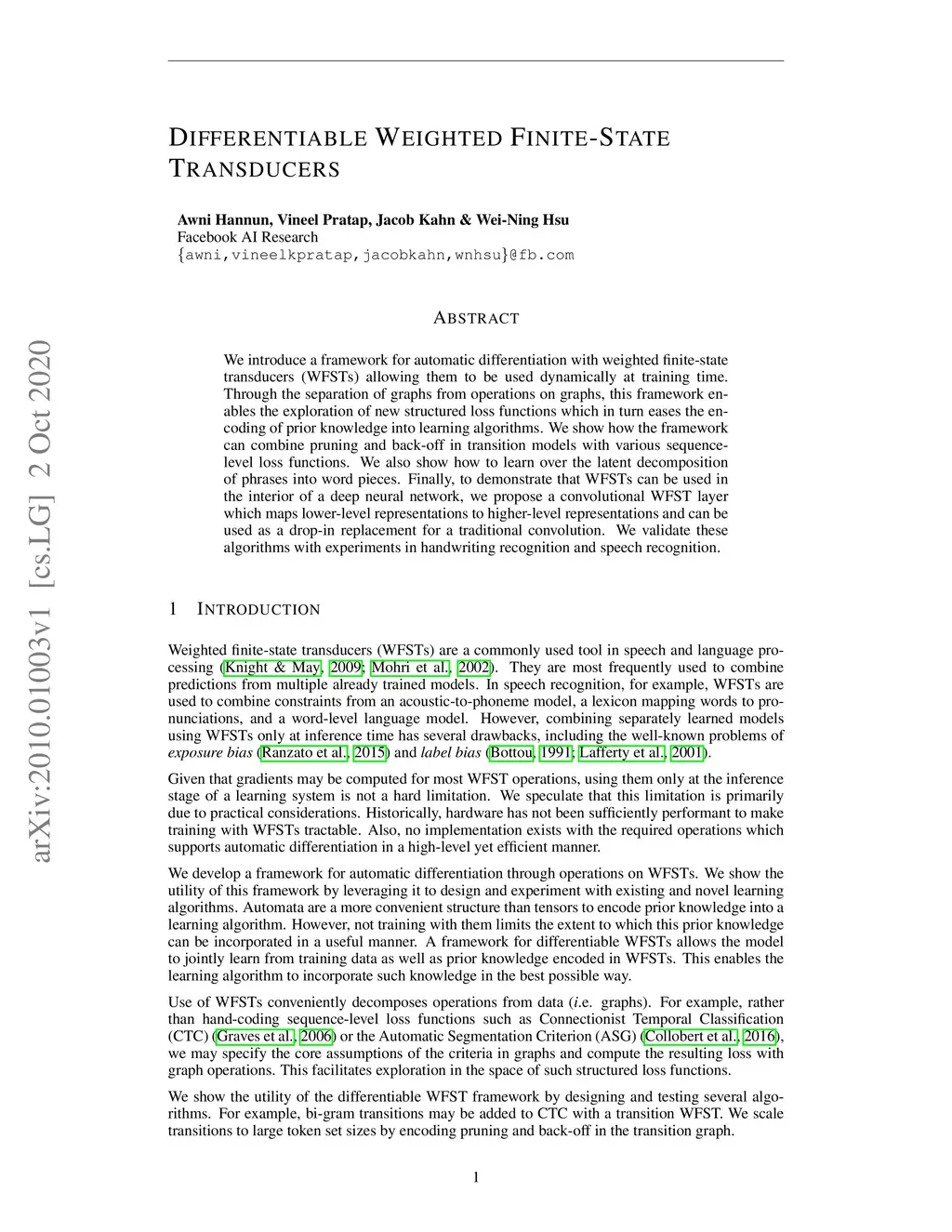 We introduce a framework for automatic differentiation with weighted finite-state transducers (WFSTs) allowing them to be used dynamically at training time. Through the separation of graphs from operations on graphs, this framework enables the exploration of new structured loss functions which in turn eases the encoding of prior knowledge into learning algorithms. We show how the framework can combine pruning and back-off in transition models with various sequence-level loss functions. We also show how to learn over the latent decomposition of phrases into word pieces. Finally, to demonstrate that WFSTs can be used in the interior of a deep neural network, we propose a convolutional WFST layer which maps lower-level representations to higher-level representations and can be used as a drop-in replacement for a traditional convolution. We validate these algorithms with experiments in handwriting recognition and speech recognition.