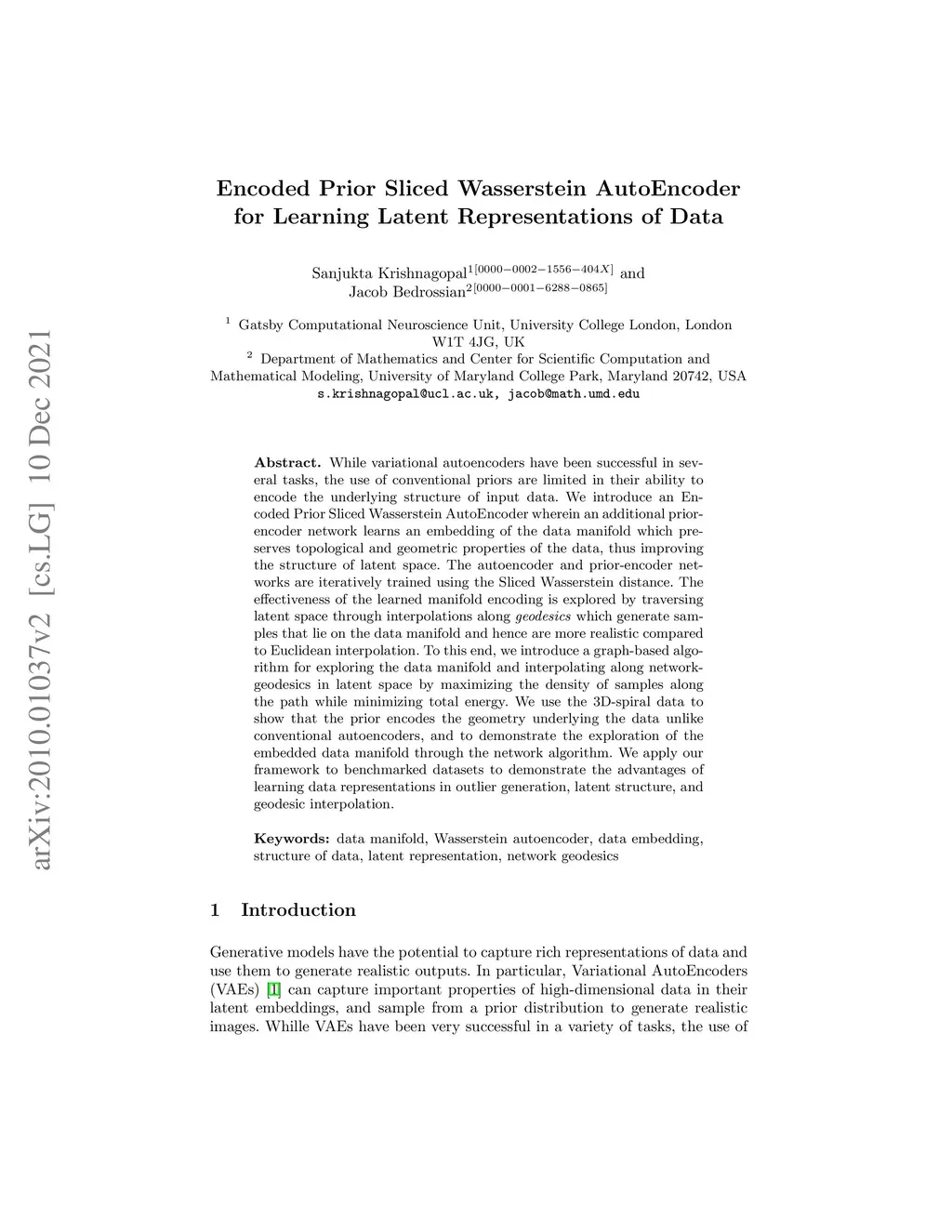 While variational autoencoders have been successful in several tasks, the use of conventional priors are limited in their ability to encode the underlying structure of input data. We introduce an Encoded Prior Sliced Wasserstein AutoEncoder wherein an additional prior-encoder network learns an embedding of the data manifold which preserves topological and geometric properties of the data, thus improving the structure of latent space. The autoencoder and prior-encoder networks are iteratively trained using the Sliced Wasserstein distance. The effectiveness of the learned manifold encoding is explored by traversing latent space through interpolations along geodesics which generate samples that lie on the data manifold and hence are more realistic compared to Euclidean interpolation. To this end, we introduce a graph-based algorithm for exploring the data manifold and interpolating along network-geodesics in latent space by maximizing the density of samples along the path while minimizing total energy. We use the 3D-spiral data to show that the prior encodes the geometry underlying the data unlike conventional autoencoders, and to demonstrate the exploration of the embedded data manifold through the network algorithm. We apply our framework to benchmarked image datasets to demonstrate the advantages of learning data representations in outlier generation, latent structure, and geodesic interpolation.