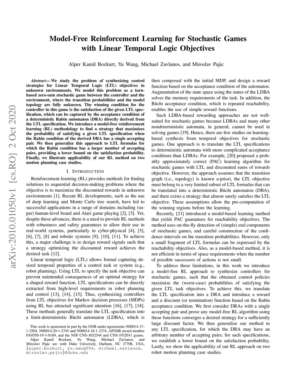 We study the problem of synthesizing control strategies for Linear Temporal Logic (LTL) objectives in unknown environments. We model this problem as a turn-based zero-sum stochastic game between the controller and the environment, where the transition probabilities and the model topology are fully unknown. The winning condition for the controller in this game is the satisfaction of the given LTL specification, which can be captured by the acceptance condition of a deterministic Rabin automaton (DRA) directly derived from the LTL specification. We introduce a model-free reinforcement learning (RL) methodology to find a strategy that maximizes the probability of satisfying a given LTL specification when the Rabin condition of the derived DRA has a single accepting pair. We then generalize this approach to LTL formulas for which the Rabin condition has a larger number of accepting pairs, providing a lower bound on the satisfaction probability. Finally, we illustrate applicability of our RL method on two motion planning case studies.