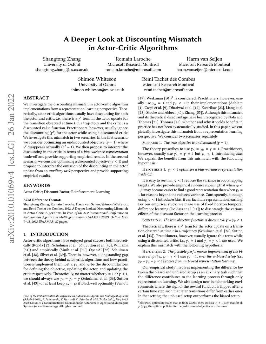 We investigate the discounting mismatch in actor-critic algorithm implementations from a representation learning perspective. Theoretically, actor-critic algorithms usually have discounting for both actor and critic, i.e., there is a term in the actor update for the transition observed at time in a trajectory and the critic is a discounted value function. Practitioners, however, usually ignore the discounting () for the actor while using a discounted critic. We investigate this mismatch in two scenarios. In the first scenario, we consider optimizing an undiscounted objective where disappears naturally . We then propose to interpret the discounting in critic in terms of a bias-variance-representation trade-off and provide supporting empirical results. In the second scenario, we consider optimizing a discounted objective () and propose to interpret the omission of the discounting in the actor update from an auxiliary task perspective and provide supporting empirical results.