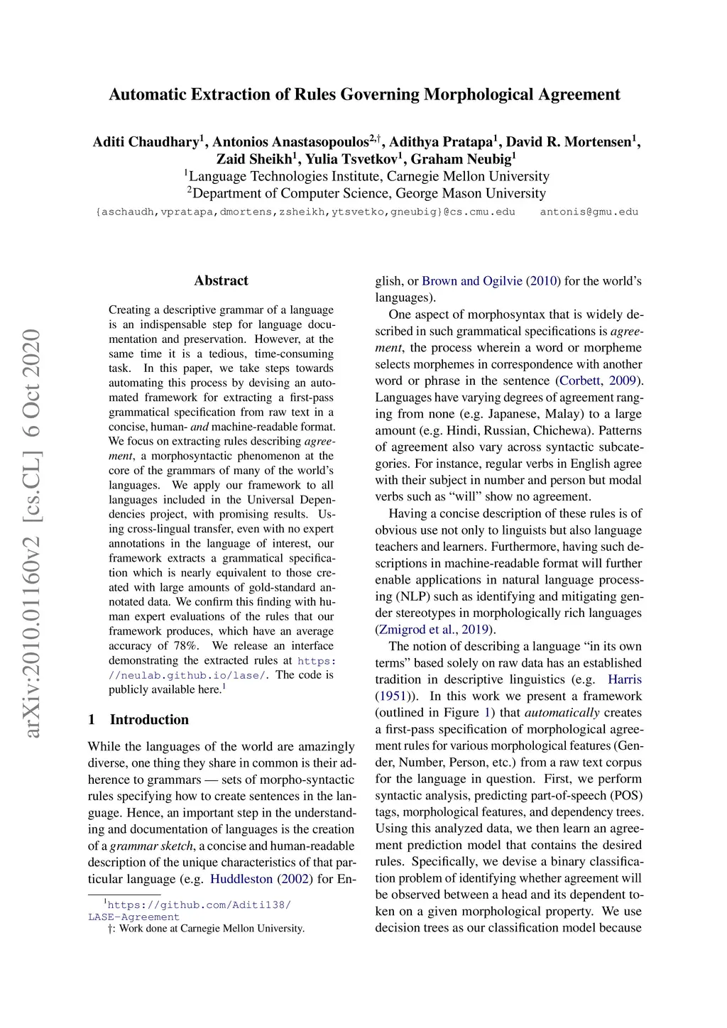Automatic Extraction of Rules Governing Morphological Agreement