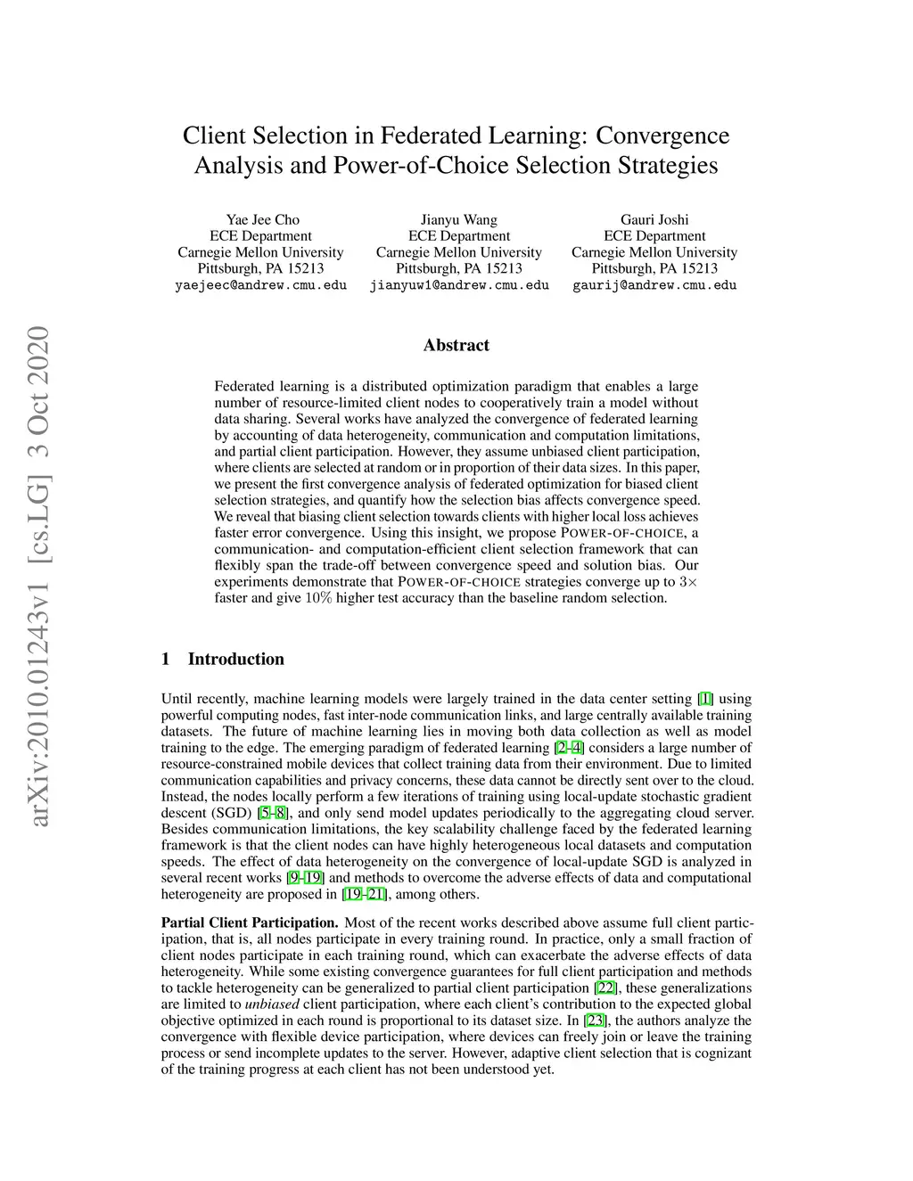 Federated learning is a distributed optimization paradigm that enables a large number of resource-limited client nodes to cooperatively train a model without data sharing. Several works have analyzed the convergence of federated learning by accounting of data heterogeneity, communication and computation limitations, and partial client participation. However, they assume unbiased client participation, where clients are selected at random or in proportion of their data sizes. In this paper, we present the first convergence analysis of federated optimization for biased client selection strategies, and quantify how the selection bias affects convergence speed. We reveal that biasing client selection towards clients with higher local loss achieves faster error convergence. Using this insight, we propose Power-of-Choice, a communication- and computation-efficient client selection framework that can flexibly span the trade-off between convergence speed and solution bias. Our experiments demonstrate that Power-of-Choice strategies converge up to 3 faster and give % higher test accuracy than the baseline random selection.